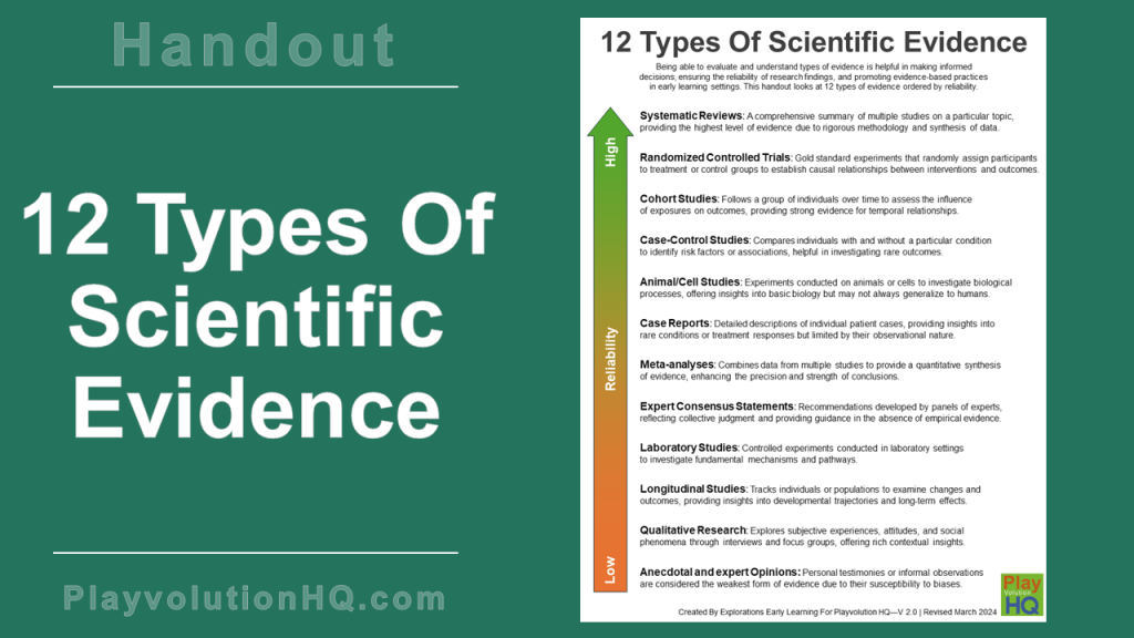 This handout looks at 12 types of evidence ordered by reliability. Being able to evaluate and understand types of evidence is helpful in making informed decisions, ensuring the reliability of research findings, and promoting evidence-based practices in early learning settings.