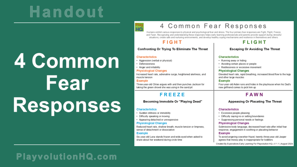 This handout explains 4 common fear responses. Understanding these responses can come in handy in early learning settings. For example, when helping a new child settle into the program, supporting children in navigating developmentally appropriate risk, or helping kids learn to face fears.