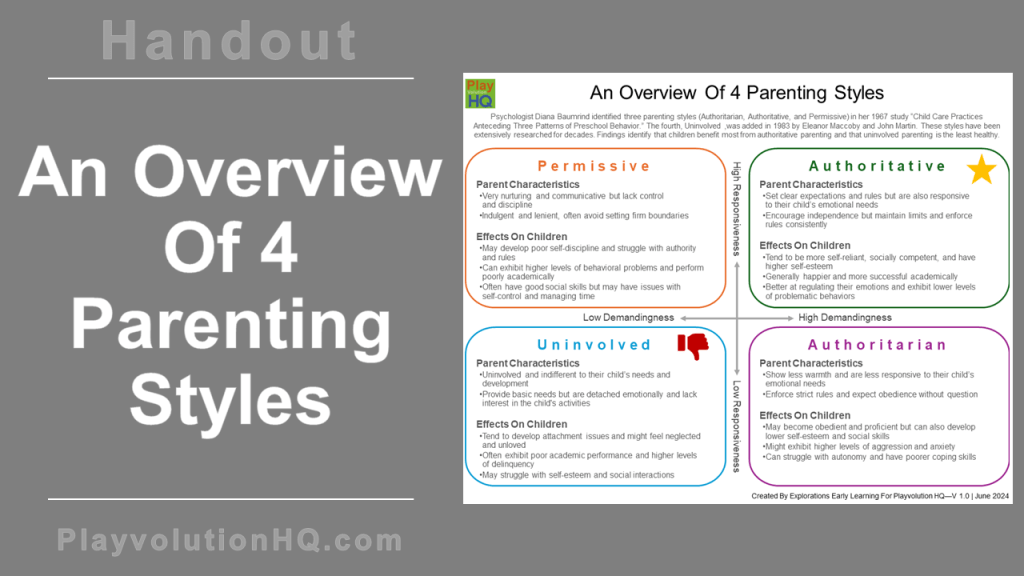 This handy handout explains 4 parenting styles. Psychologist Diana Baumrind identified 3 of these parenting styles (Authoritarian, Authoritative, and Permissive) in her 1967 study “Child Care Practices Anteceding Three Patterns of Preschool Behavior.” The fourth, Uninvolved, was added in 1983 by Eleanor Maccoby and John Martin. These styles have been extensively researched for decades. Findings identify that children benefit most from authoritative parenting and that uninvolved parenting is the least healthy.