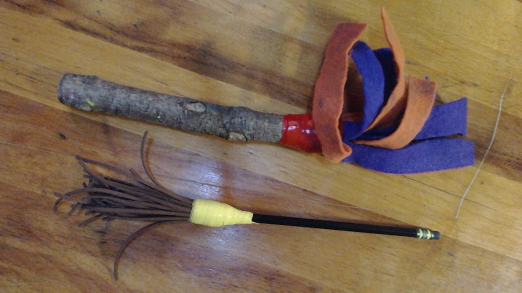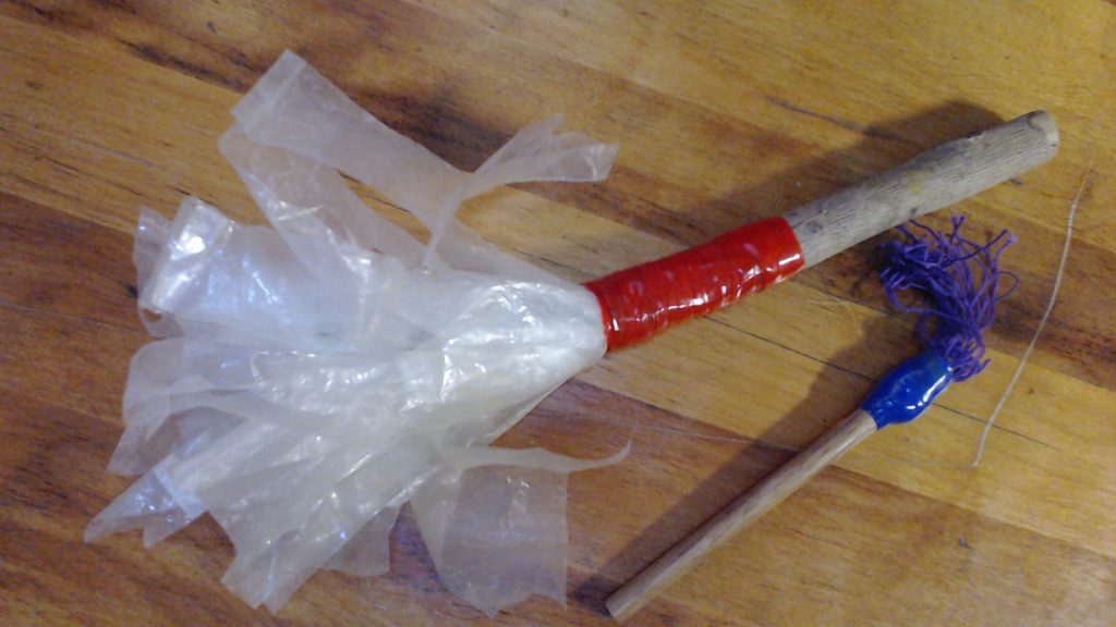 I made the top one with a hunk of 1-inch diameter maple branch, red silicone tape, and slices of plastic sheeting. I made the lower one with a piece of oak dowel,  blue silicone tape, and purple embroidery floss.
