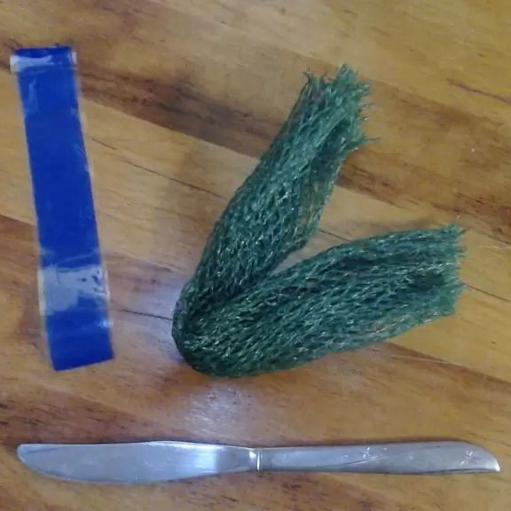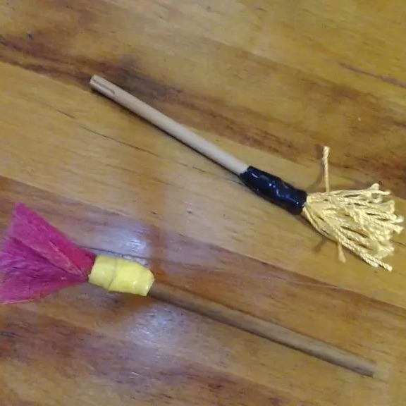 In these examples, I used quarter-inch dowel handles; the bristles are made with yellow nylon twine and a pink produce bag.