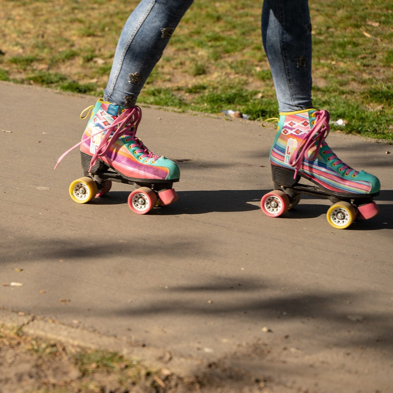 Some children exploring back and forth schema play put themselves in motion with rollerskates, skateboards, scooters, trikes, and bikes.