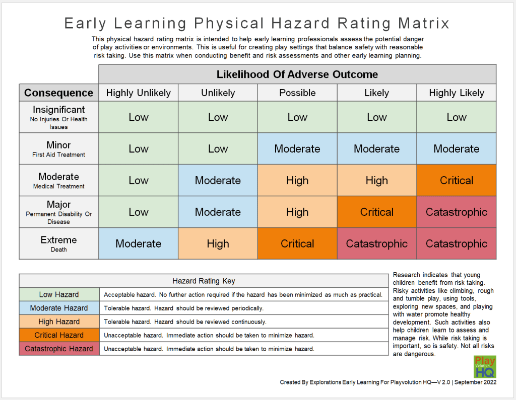 Now, determine the activity’s Risk Rating using the Early Learning Physical Hazard Rating Matrix. To do this, determine what the likelihood of an adverse outcome is for the activity you are considering based on the likely consequence. For example, roasting hot dogs in small well-supervised groups is Highly Unlikely to have any adverse effects, and any consequence would be minimal. The chances of anything worse than a Minor consequence requiring first aid is very unlikely.