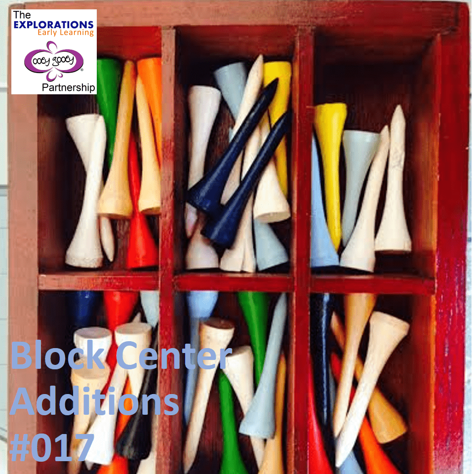 Golf tees become people, building decorations, and more when added to block play.