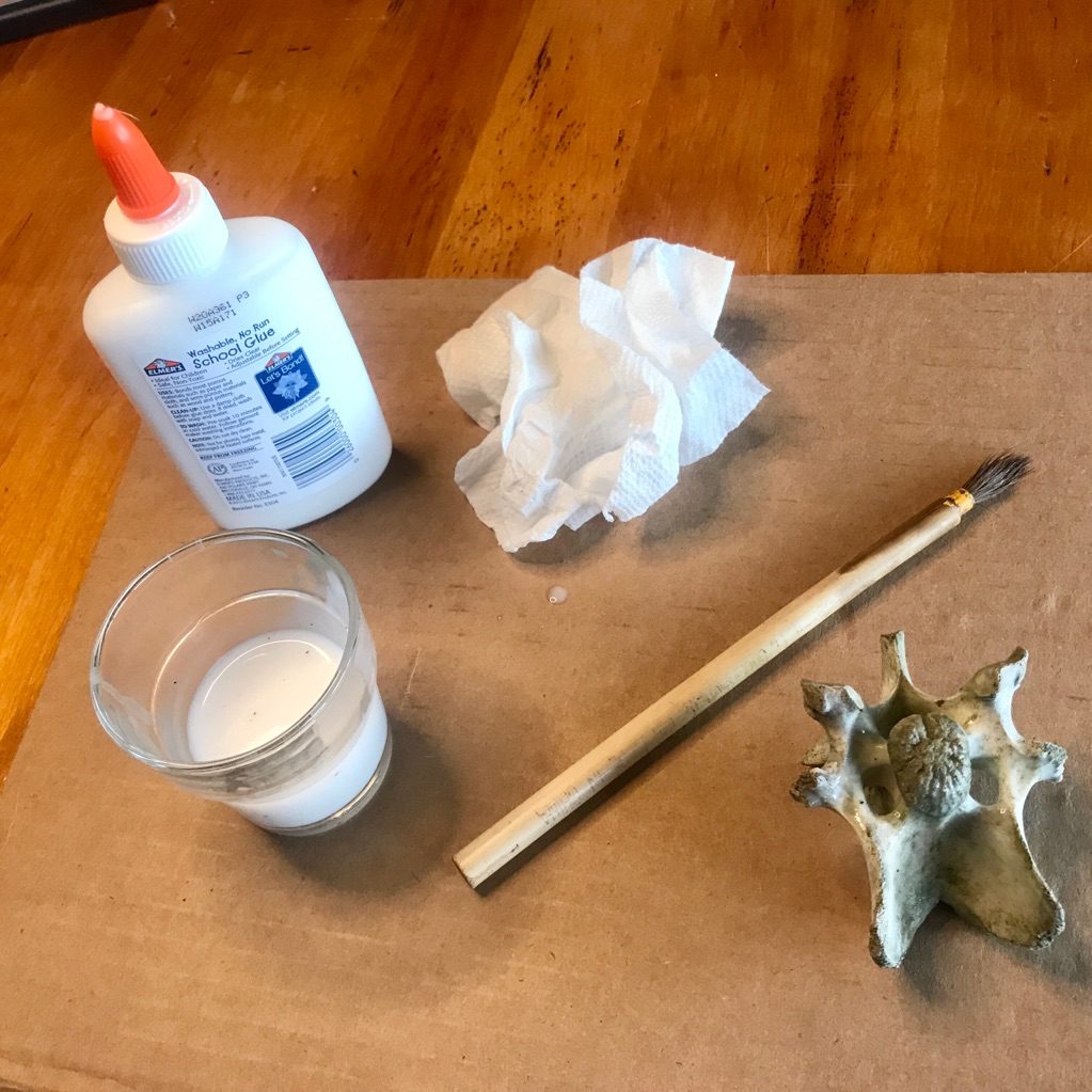 The glue and water mixture is pretty forgiving, so application doesn’t have to be perfect–and since you’ll be applying multiple coats it’s OK if you miss a spot or two. Doing this work on a small hunk of cardboard protects your table top. After five minutes or so, inspecting the bone for pooling glue or glue drips and wipe them away with the paintbrush.
