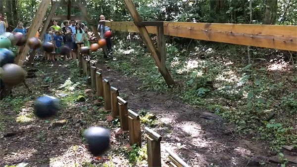 They can also be utilized for all kinds of STEM play and learning. A contraption like the one below may take up too much space, but a bowling ball pendulum would be a great addition to a play space.