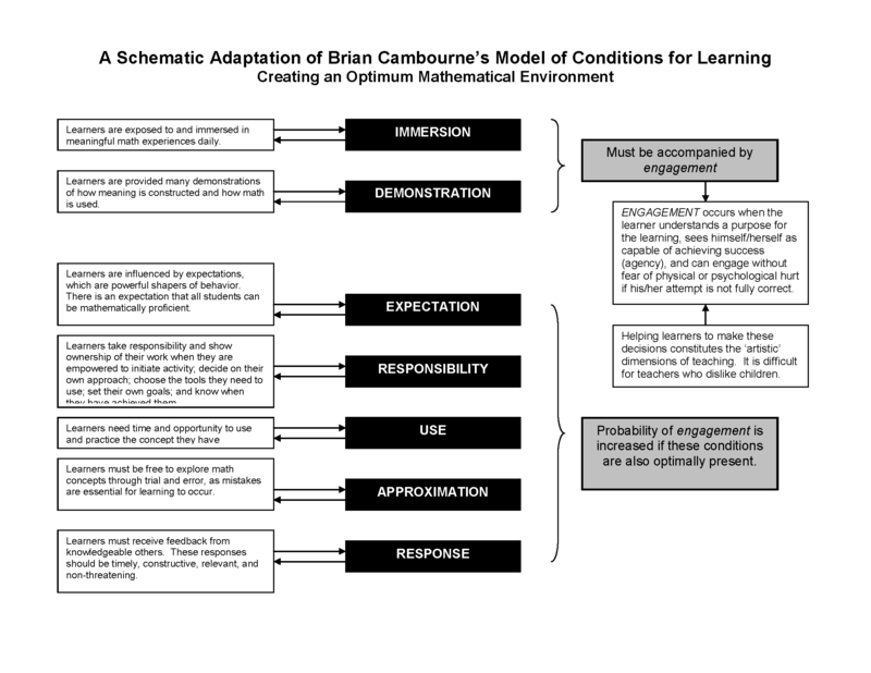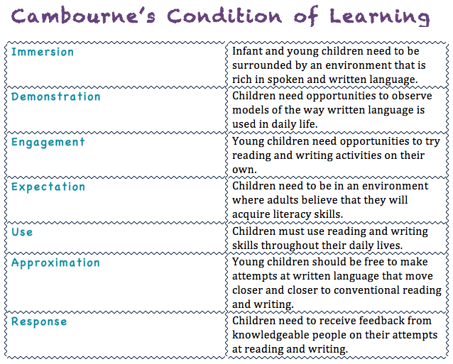 His research primarily focuses on professional development for literacy education. Cambourne developed the following seven Conditions of Learning. These are typically applied to literacy skills, but can cross to other content areas.