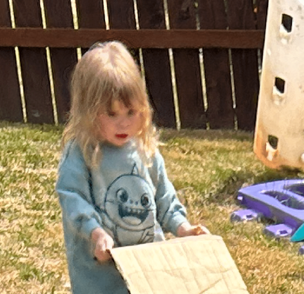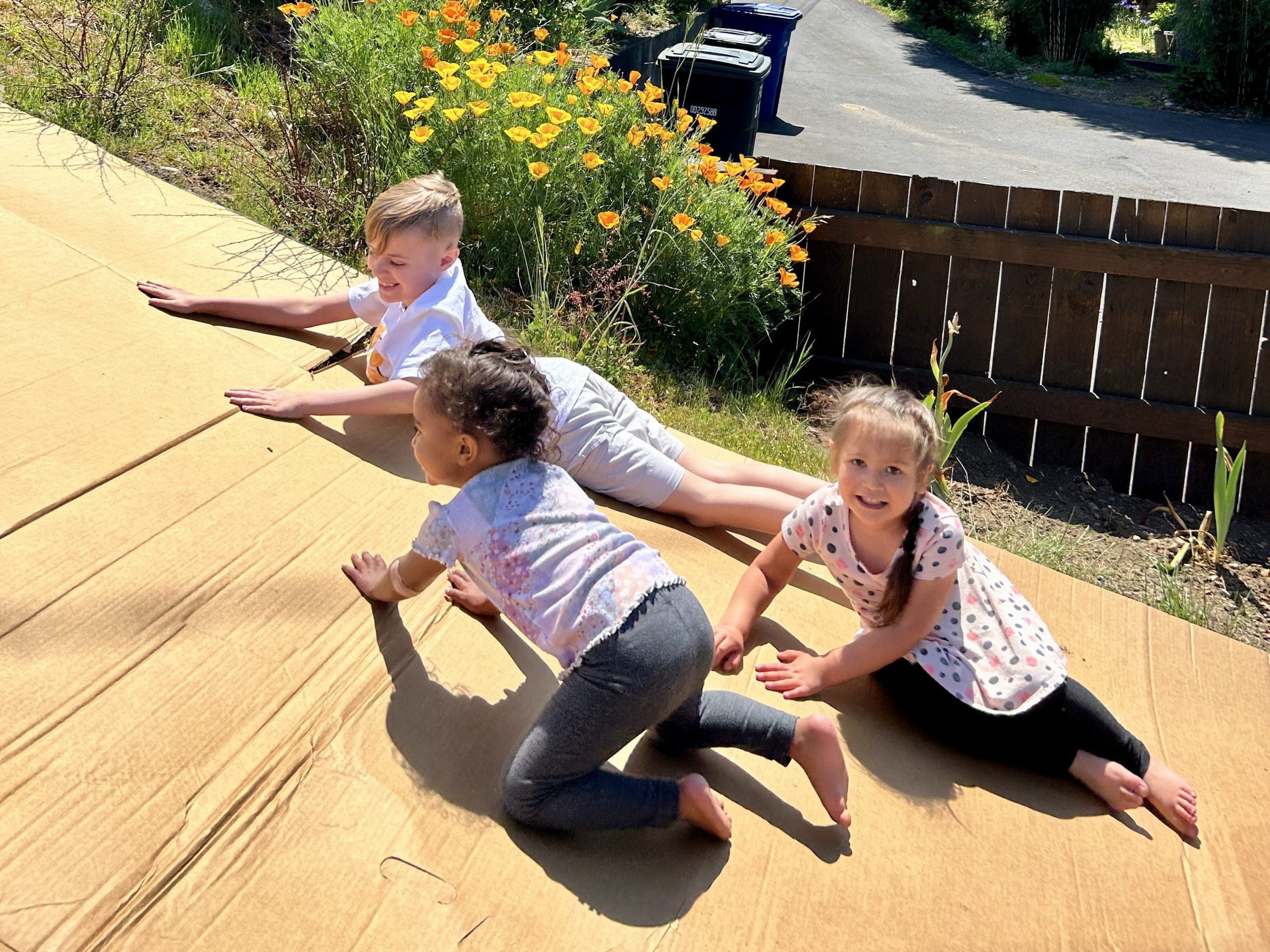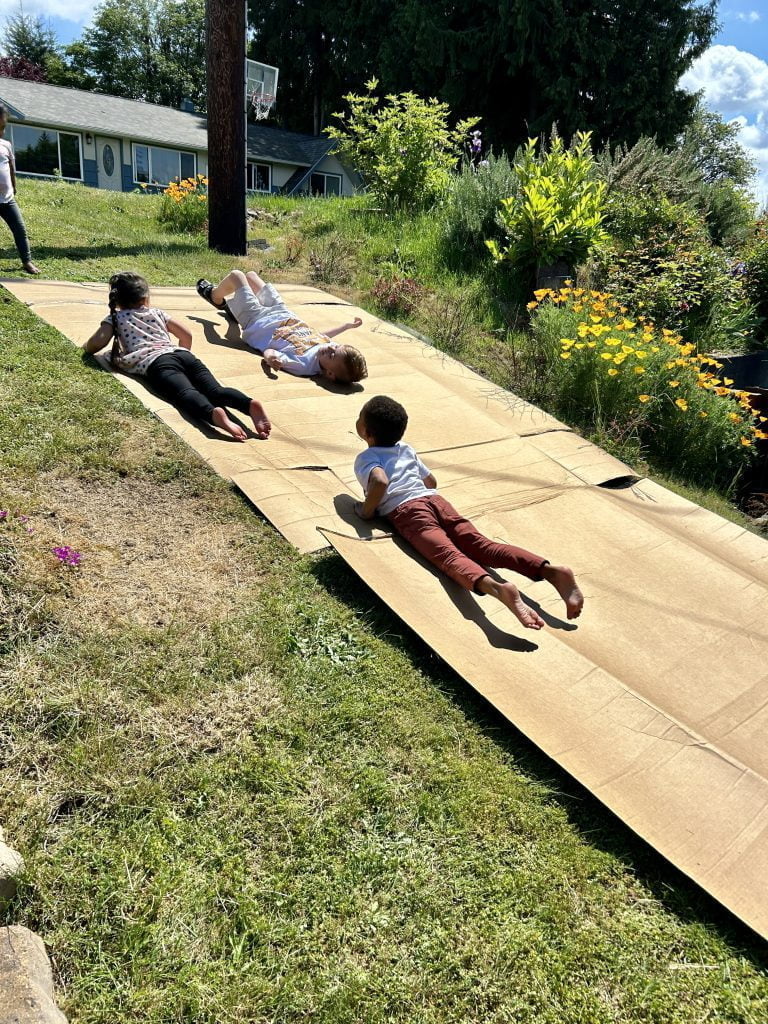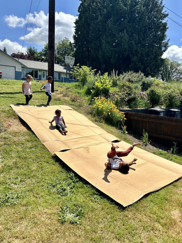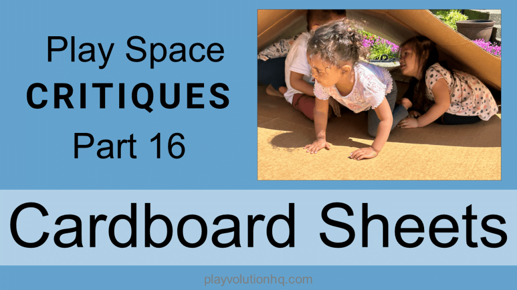 This play space critique takes a squizz at some loose parts play involving cardboard sheets that happened somewhen recently. The following photos and videos were sent my way by Autumn, a family child care provider in the state of Washington. We’ve been corresponding since she attended some of my online trainings. I dig the way she embraces child-led play. Let’s take a look.