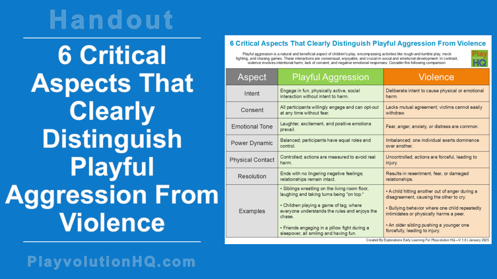 In contrast, violence involves intentional harm, a lack of mutual agreement, and negative emotional outcomes. By focusing on intent, consent, emotional tone, power dynamics, physical control, and resolution, this resource supports responsible adults in creating environments where children can safely explore boundaries, build relationships, grow through play, and identify when play shifts into harmful territory.