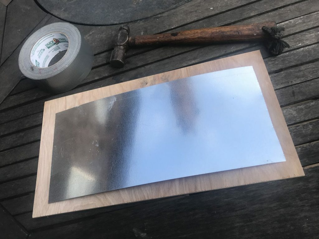 Duct tape the flashing to the backer board as shown. This holds the steel to the board and keeps little fingers away from the cut edges of the steel, which can be sharp.