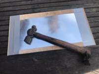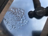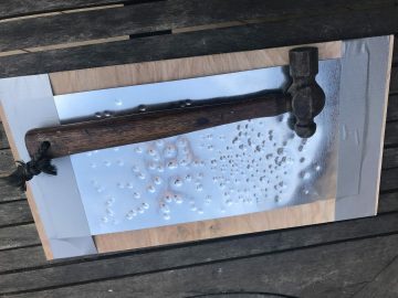 Set the steel covered backer board on a solid surface like a sturdy table, paved outside surface, classroom floor, or large upended log, and let the hammering begin. You could clamp the backer board to a table to keep it from bouncing around with each hammer strike, but I recommend letting the kids hold the board sturdy with their non-hammer hand. It’ll help them develop some coordination and body awareness–and learn not to hit themselves in the hand.
