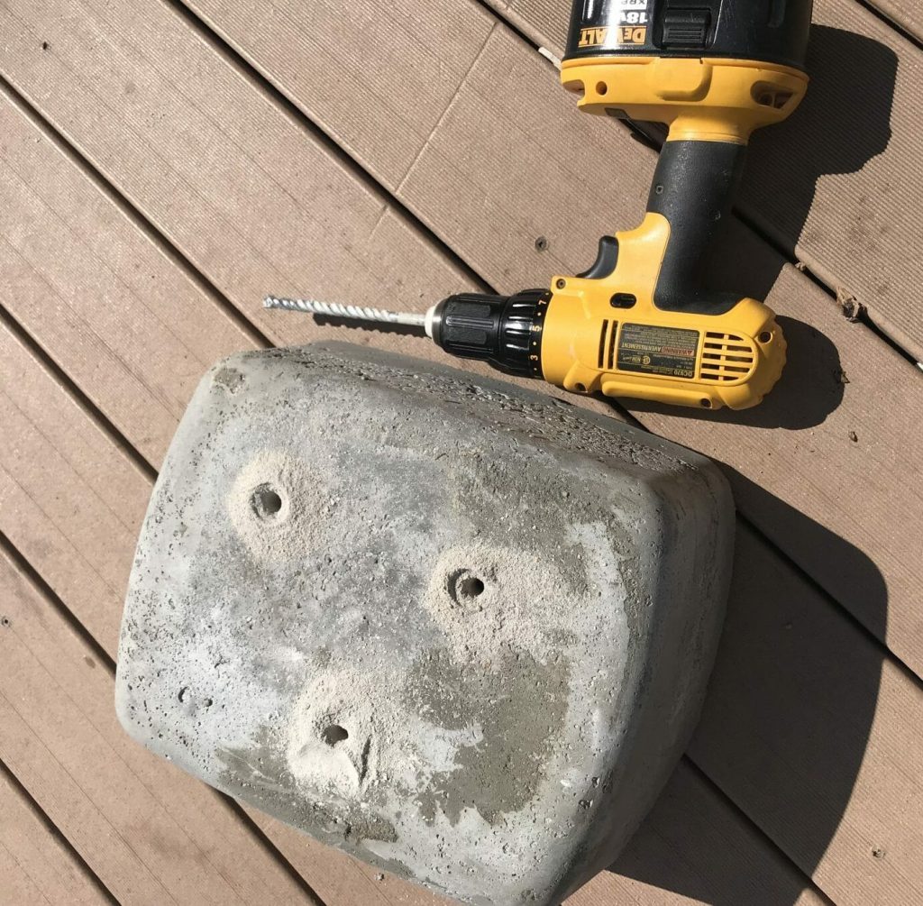 Then, flip it over and drill some drainage holes–one hole for each smaller container you used.