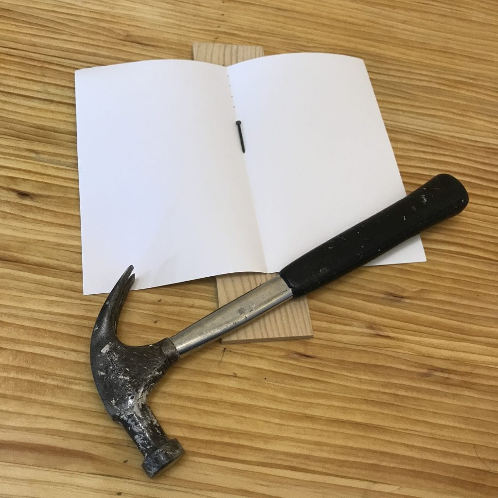 Next, you’ll need to make nail holes along the fold to make stitching the pages together in the next step. Place the piece of scrap wood under the paper to protect your work surface from holes. Then use the hammer and nail to punch a series of holes along the fold. Make the first hole about 1/2 inch in from the papers edge and space them about 1/2 inch apart as you work your way down the fold.