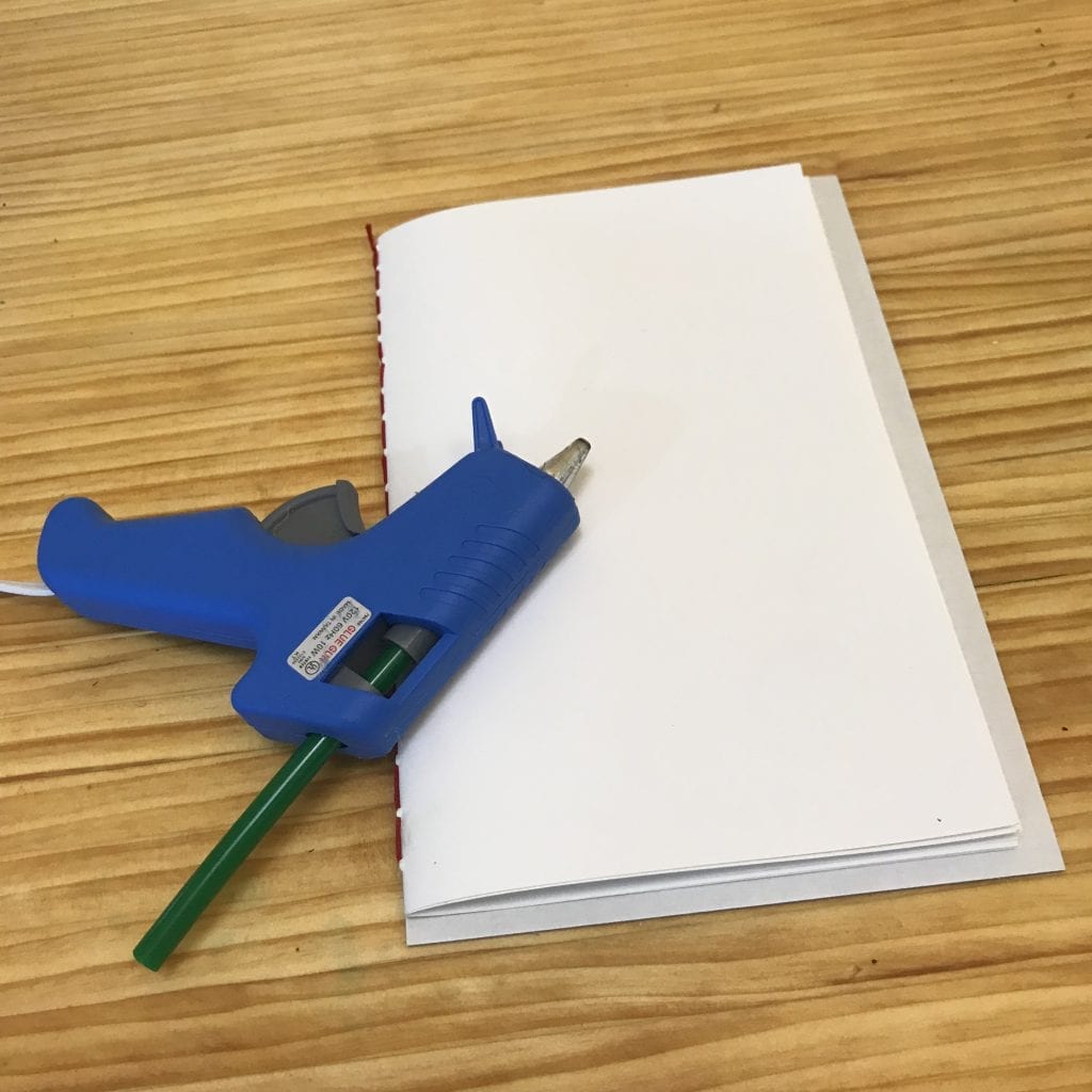 To attach the cardboard, apply hot glue to the outside of one of the books outer page and attach one of the cardboard panels. Carefully align one edge of the cardboard with the stitched side of the book so that the cardboard overhangs the pages on the other three sides. Once that’s done, flip over the book and attach the other cardboard panel.