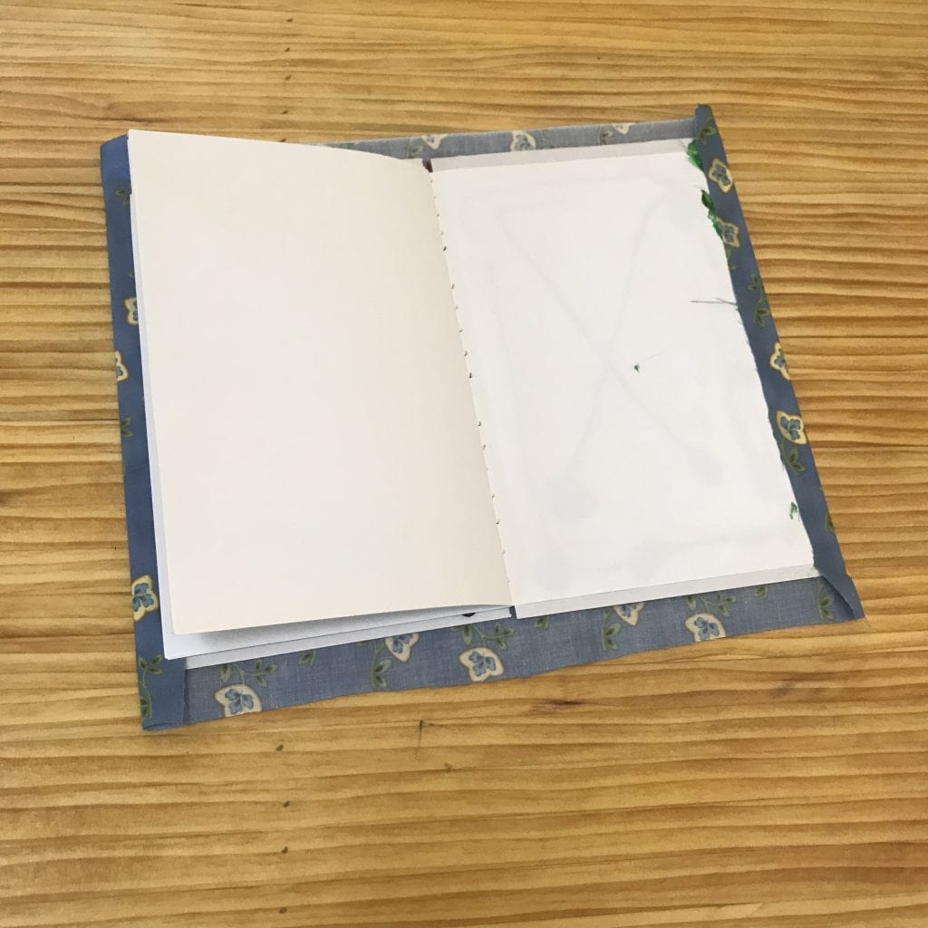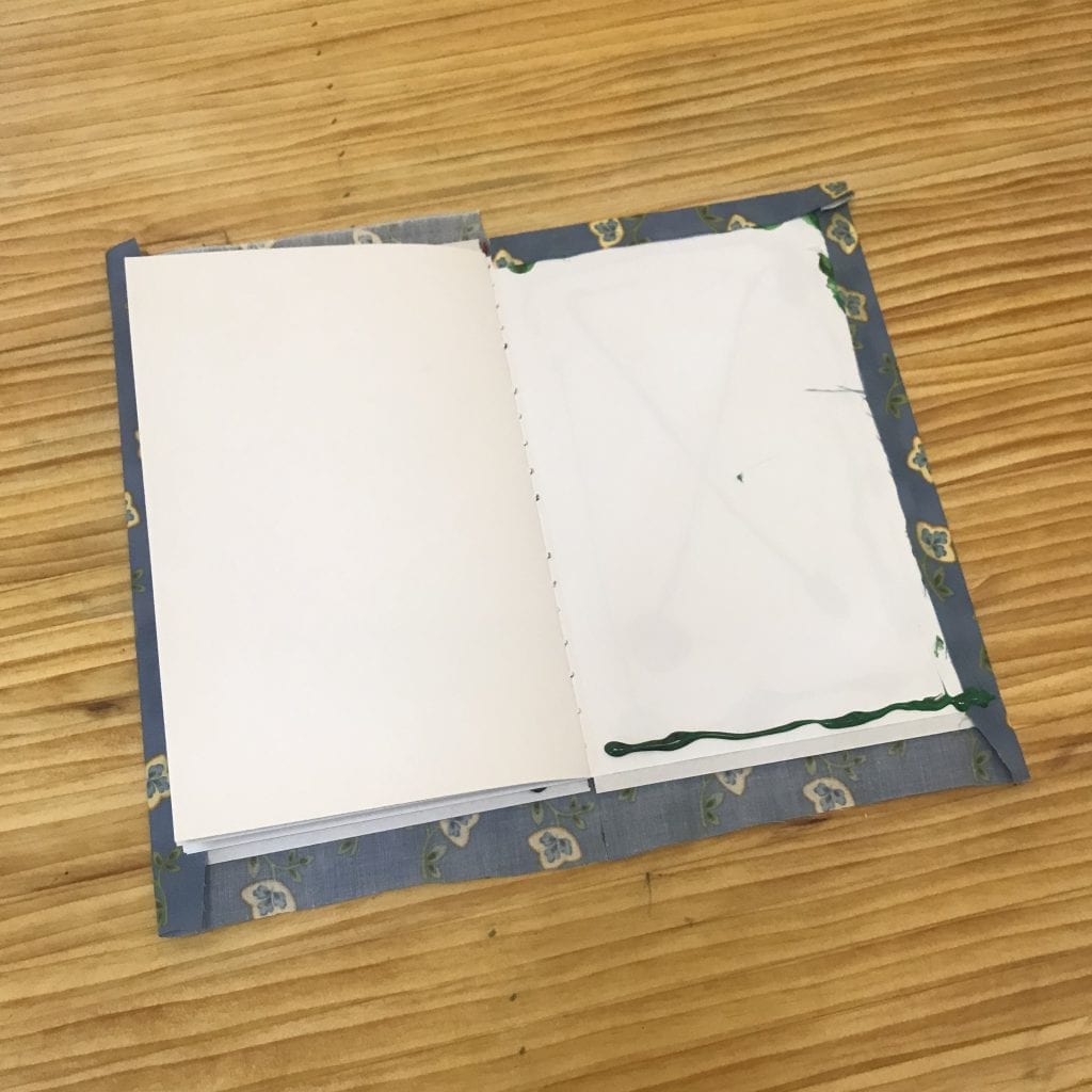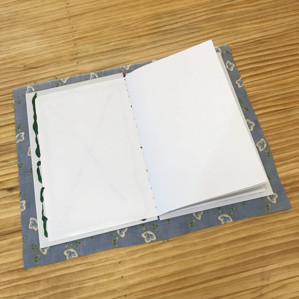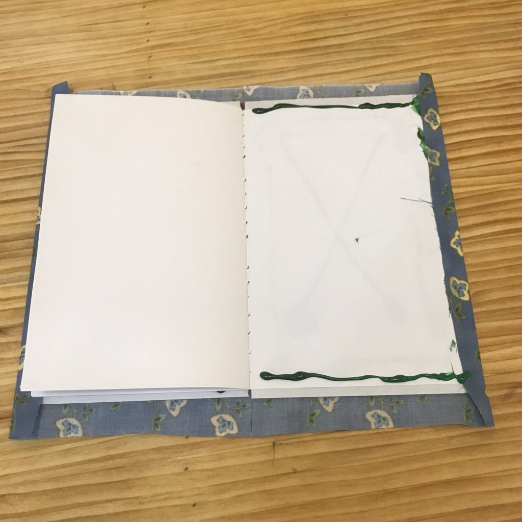 Next, repeat the gluing process on the other short edge. Experiment a bit with the fabric’s positioning before gluing. While you want the fabric to be taut and wrinkle free, you don’t want it to be tight–if you pull the fabric too tight the book will not close properly.