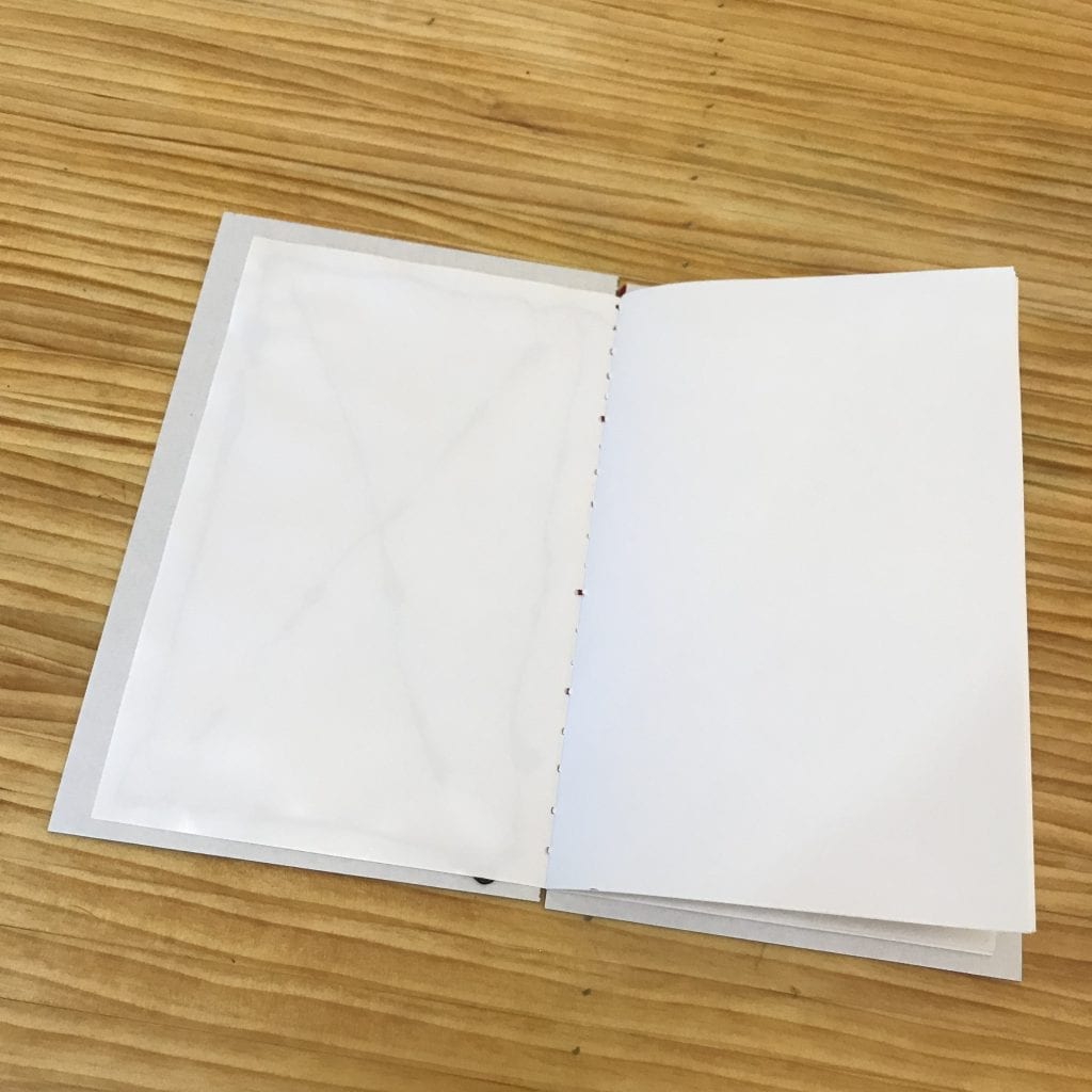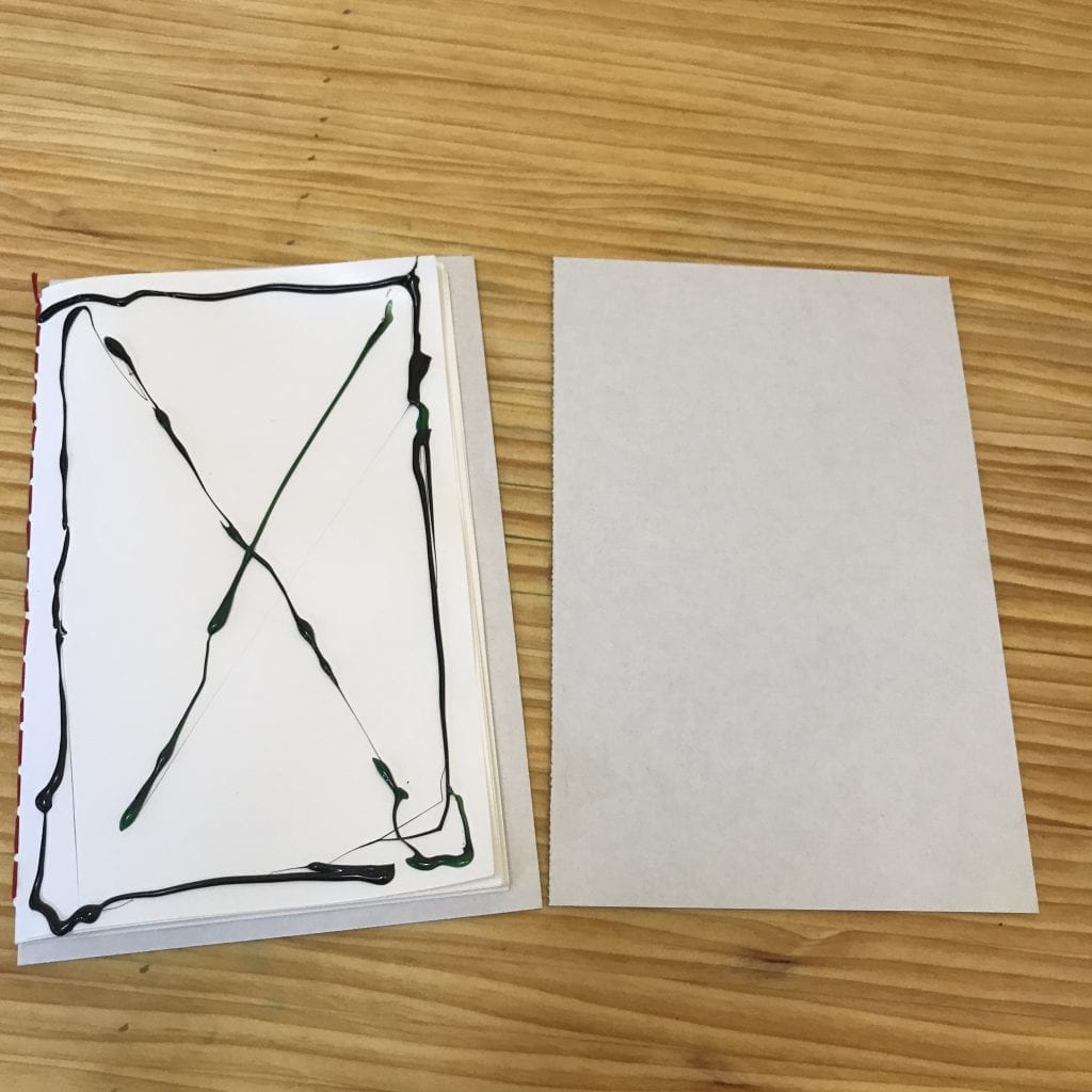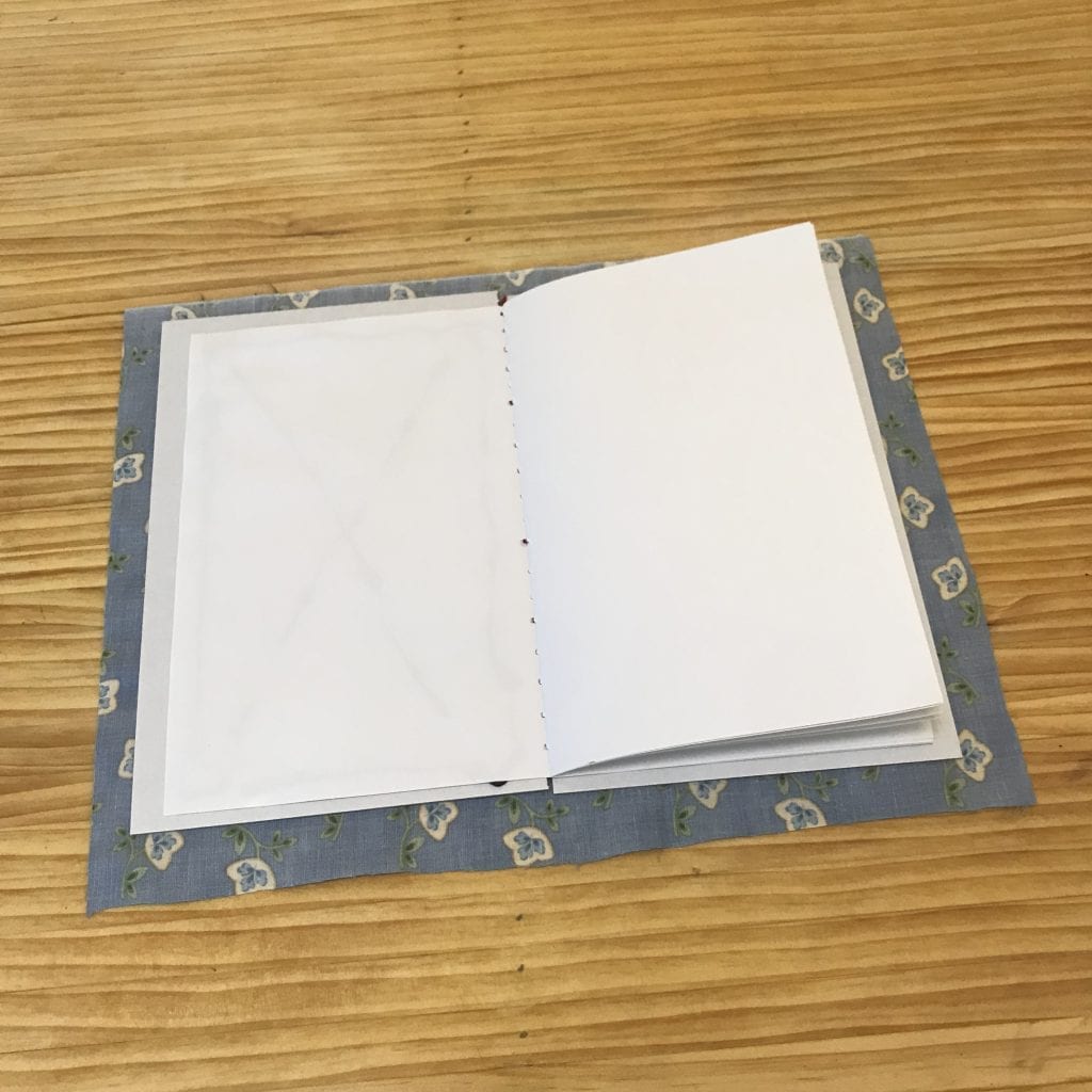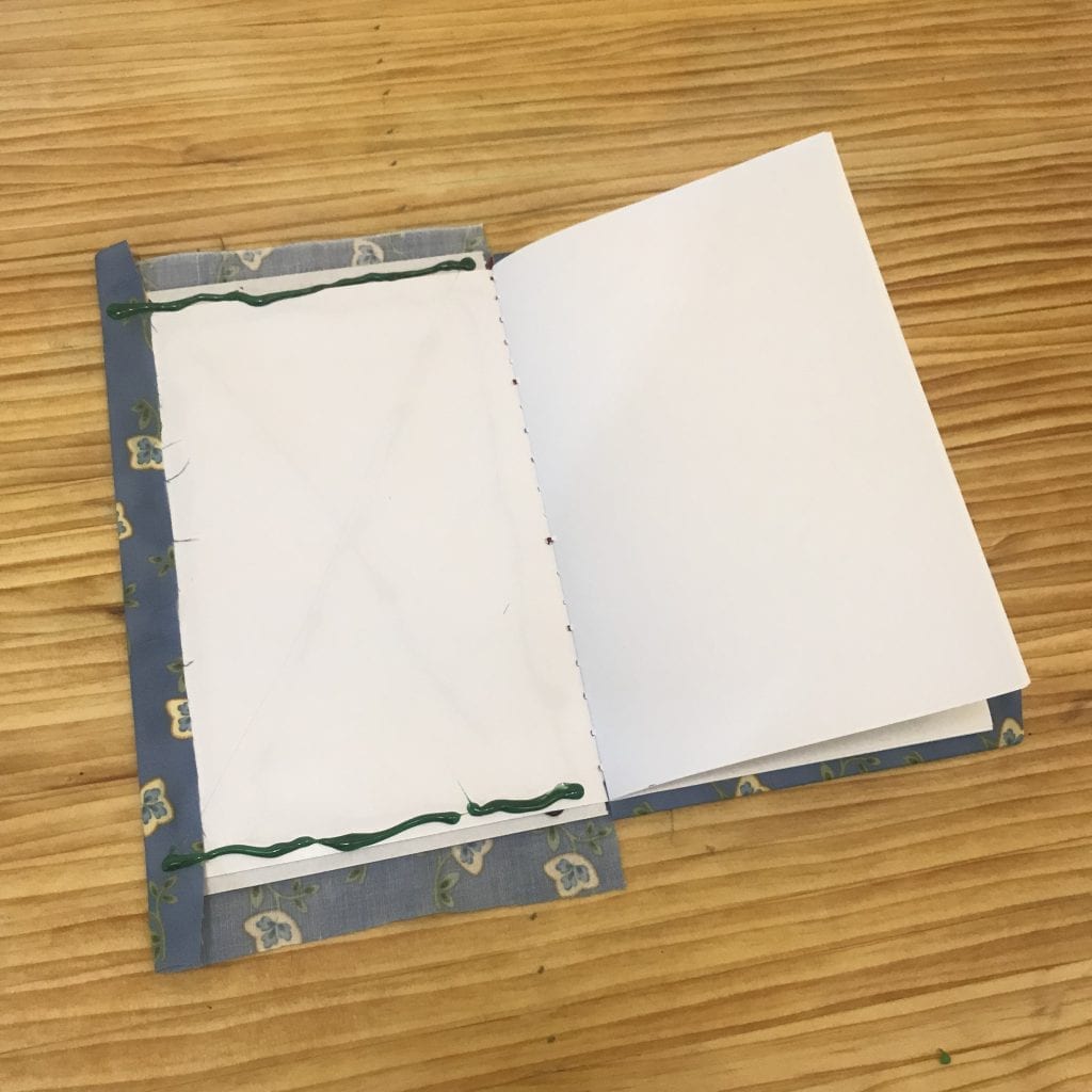 Next, repeat the gluing process on the other short edge. Experiment a bit with the fabric’s positioning before gluing. While you want the fabric to be taut and wrinkle free, you don’t want it to be tight–if you pull the fabric too tight the book will not close properly.