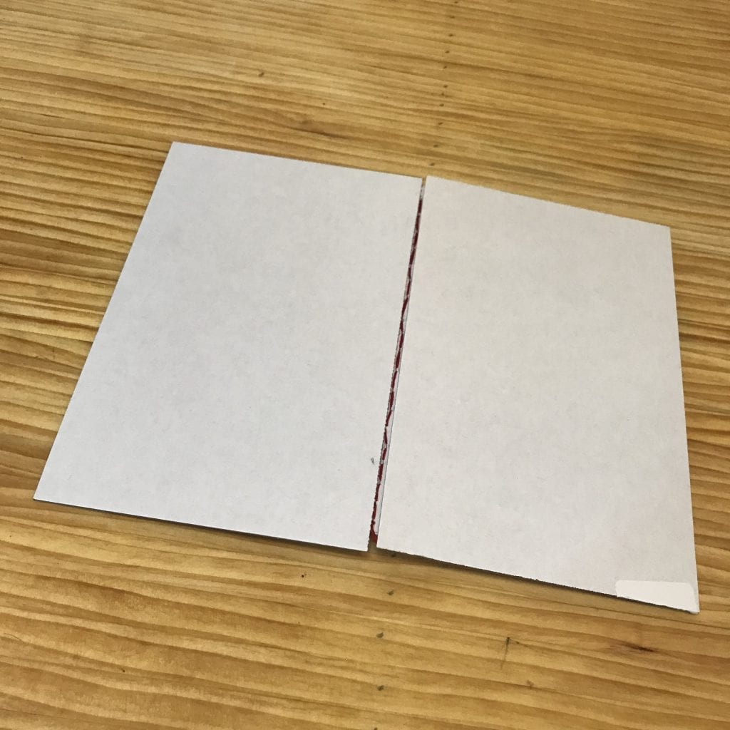 Start by cutting two 9 inch by 5.75 inch pieces of cardboard. These will serve as the book’s cover and be encased in fabric in the next step. In the example photos, we used thin un-corrugated cardboard, but thicker corrugated cardboard works fine, too.