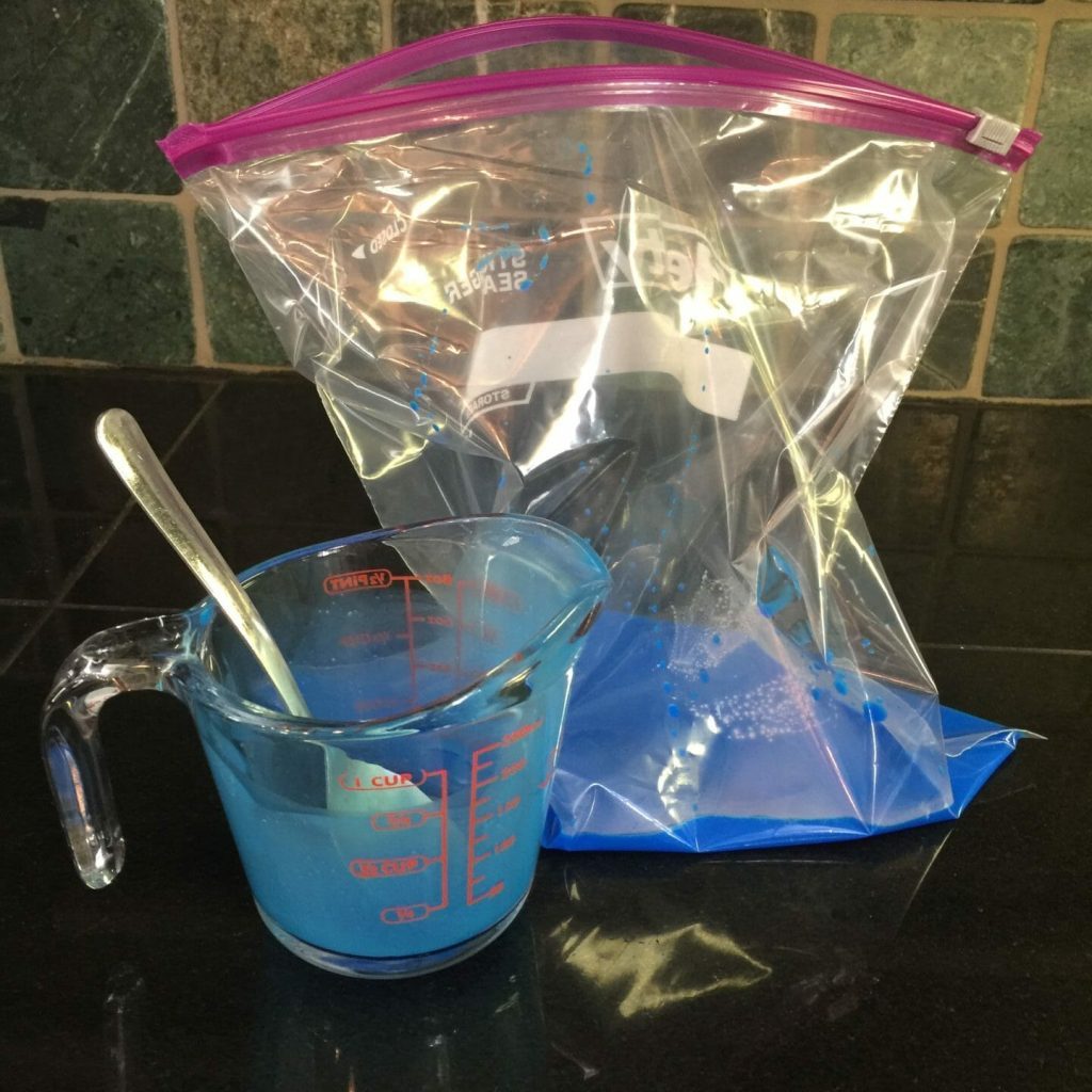 2 oz white school glue, 1/4 cup warm water, and a bit of food coloring in the measuring cup. Mix well and then pour it into the resealable plastic bag.