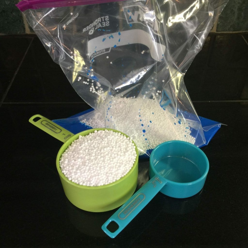 1 1/3 cups of polystyrene beads to the mixture in the bag. Close the bag and scrunch it to coat the beads.