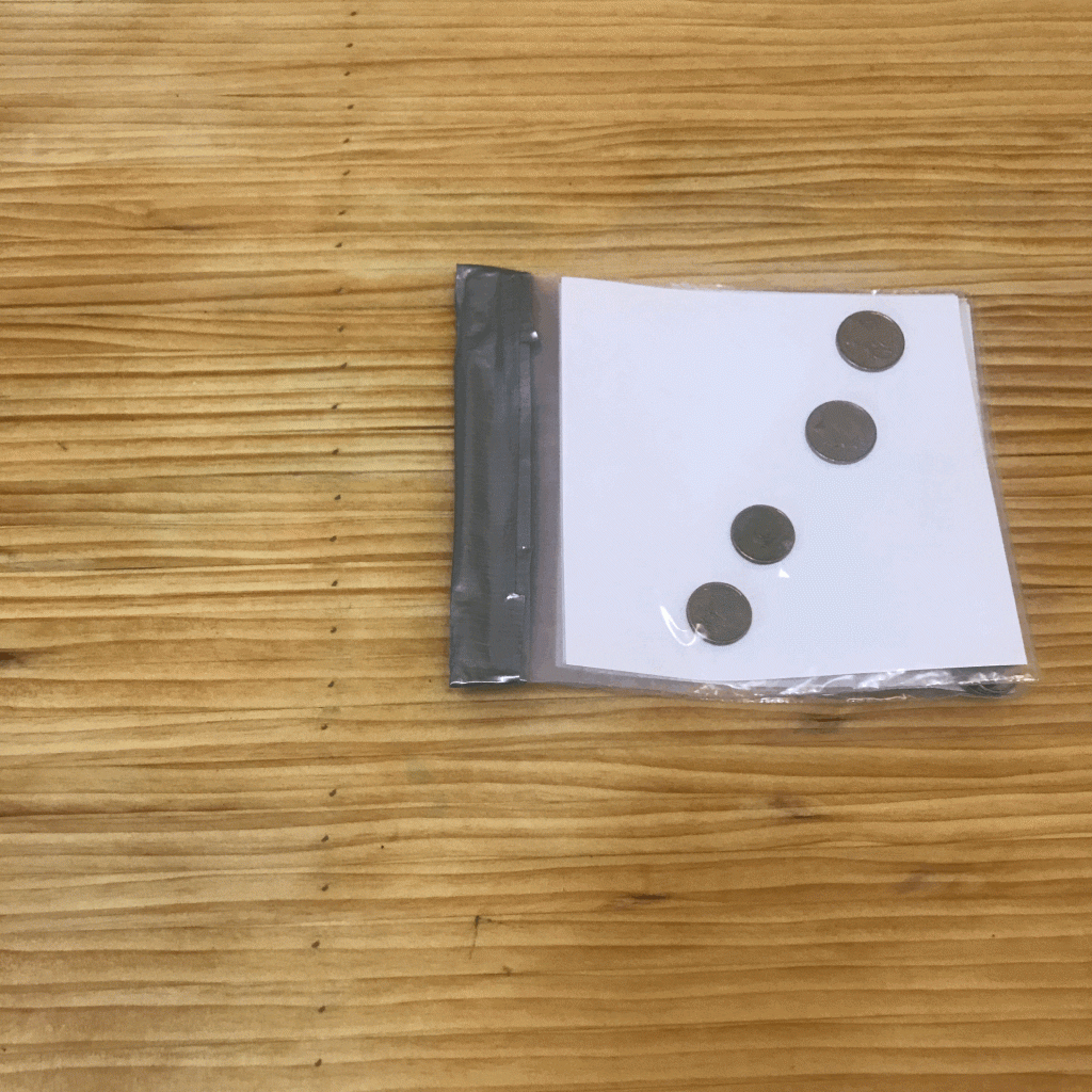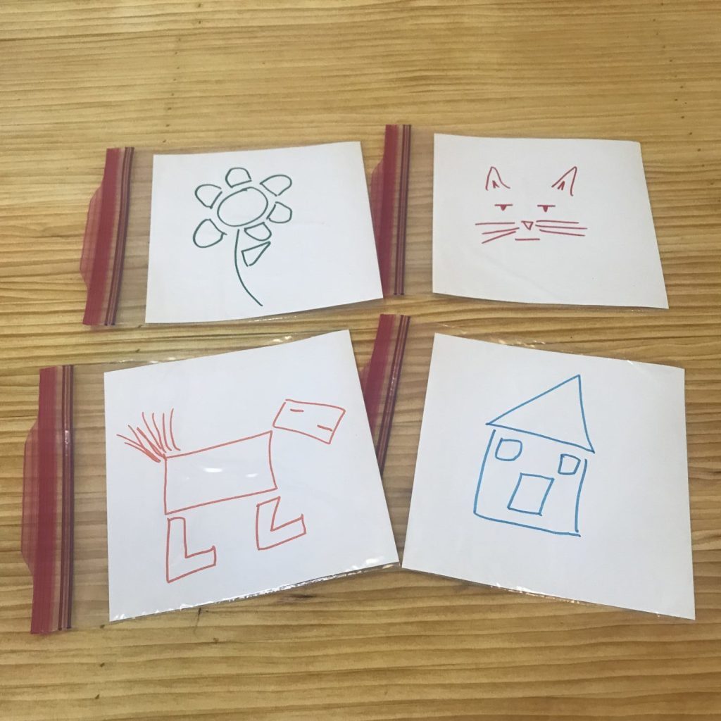 Cut pieces of paper or cardstock so it’ll easily fit into your freezer bags. Then add art and/or words to your pages. You can do this yourself, but it’ll be more fun if the little humans who will be reading the books are involved. Kids way want to write and illustrate their own stories or they may prefer to collaborate. Alternatively, you can collect objects to add to your book pages (see the coin book above).