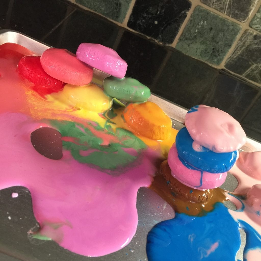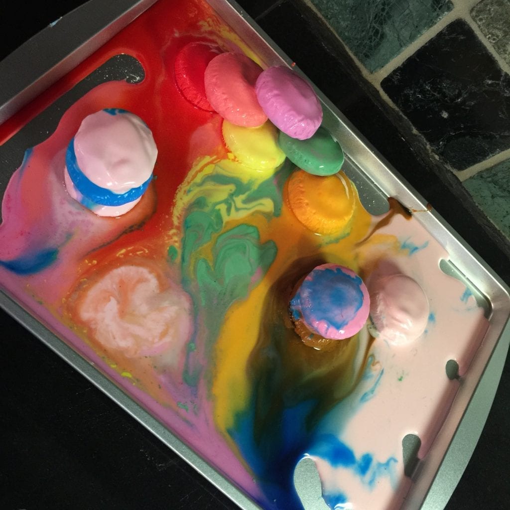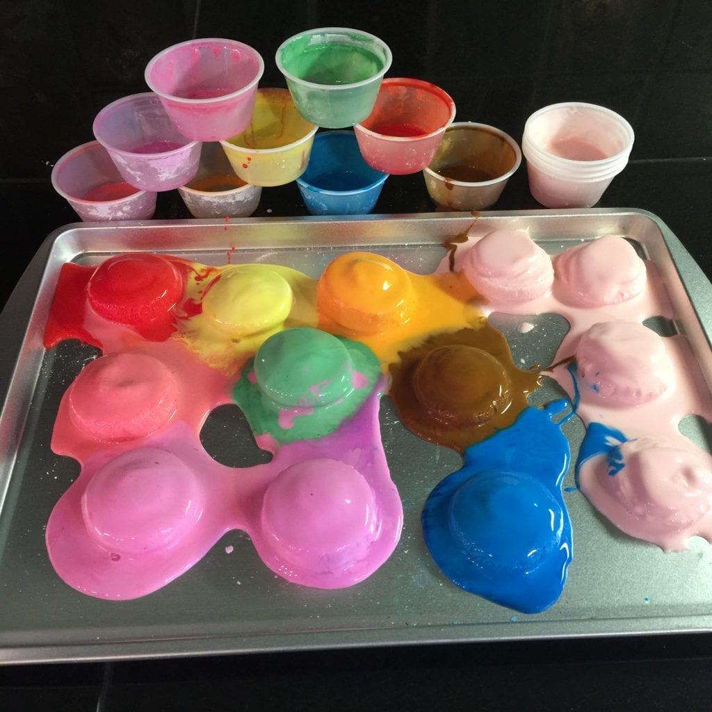 We mixed up a big batch of oobleck without coloring and then divided it into smaller containers, add color, and froze it. A cookie sheet came in handy for hauling it in and out of the freezer.