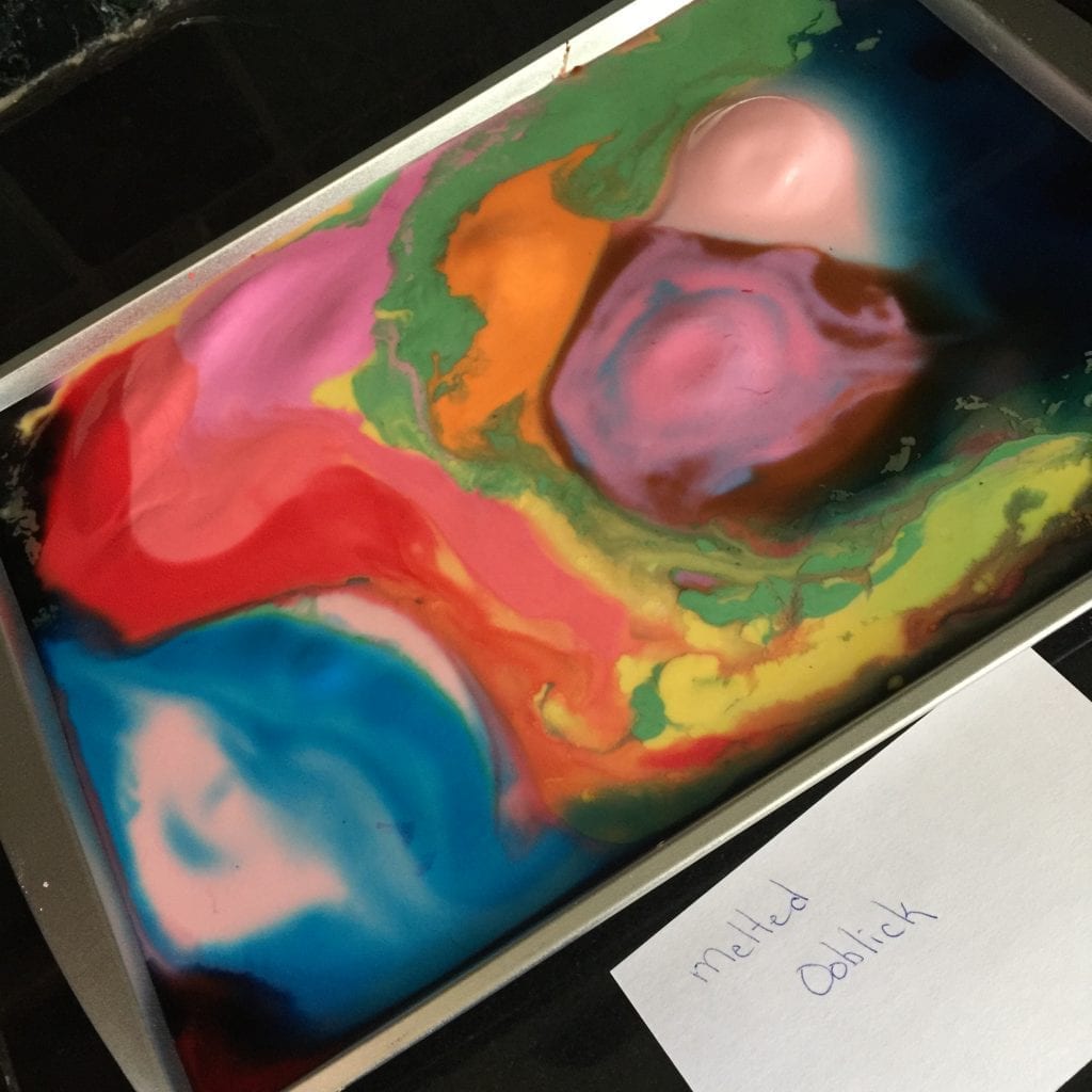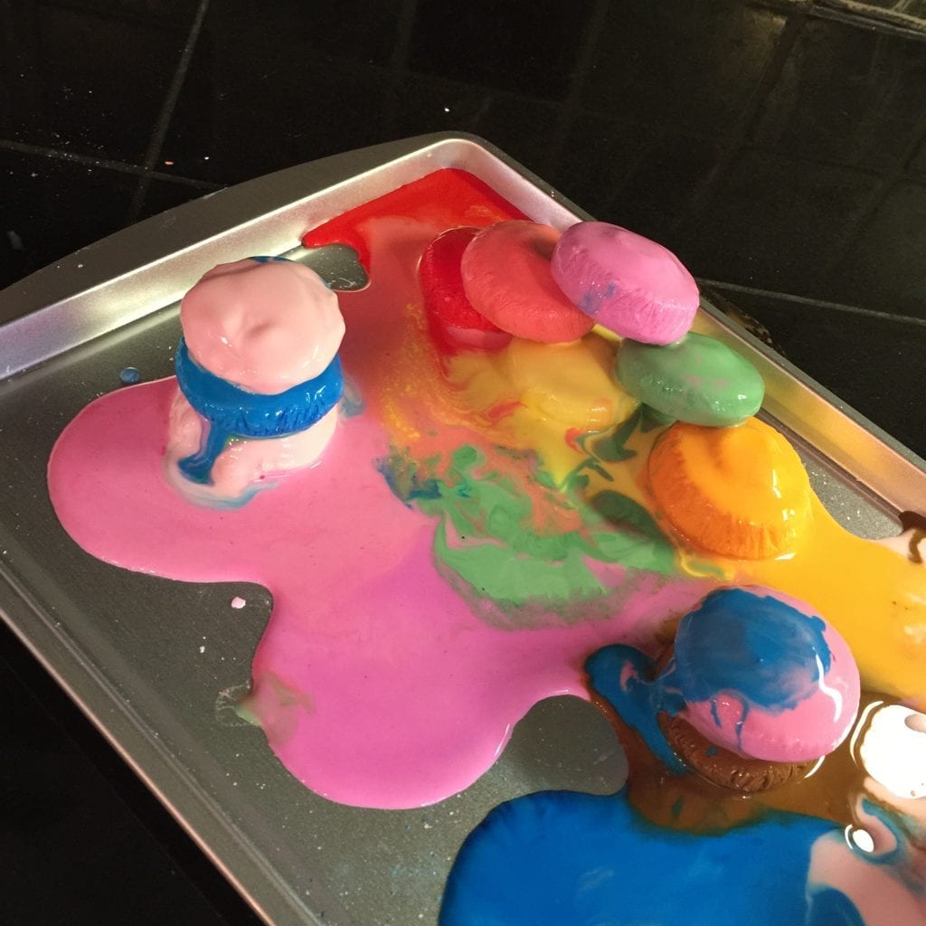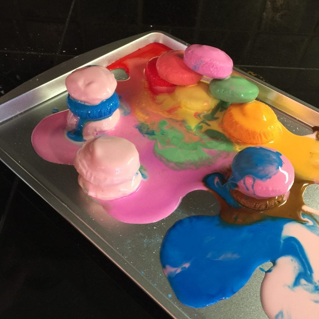 We mixed up a big batch of oobleck without coloring and then divided it into smaller containers, add color, and froze it. A cookie sheet came in handy for hauling it in and out of the freezer.