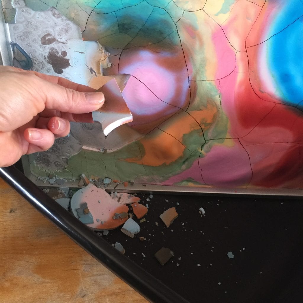 Now, all you need to do is share it with kids and let them play. You may want to just pop the frozen hunks of frozen oobleck out of their containers, plop them on a cookie sheet, and let the kids explore.