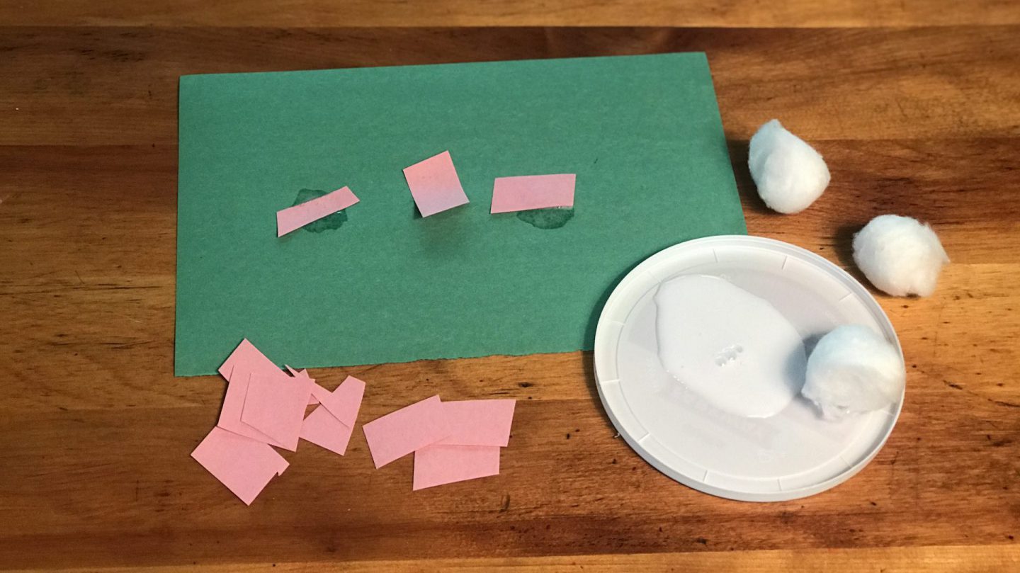 Cotton balls work great as glue applicators. Dip them into the glue, stamp the paper (or whatever) where the bond is needed, and apply the item to be adhered. A (fun?) side effect of this one is that some glue will inevitably find its way onto the gluer’s fingers, and strands of the cotton ball will stick to it–creating furry fingers. This novel situation may lead to some interesting conversations and problem-solving.
