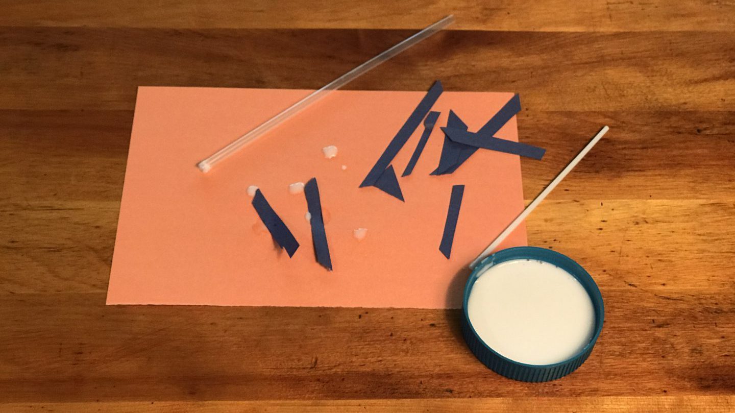 The idea here is to dip the end of the straw into the glue and dab it onto the surface of the item being glued. This one could also take a turn for the messy if a child decides to try sucking glue into the straw and then blowing it out onto the surface they want to glue. I recommend a shallow glue container to prevent that scenario (if you want to). It’s a real challenge to suck up a lot of glue from a shallow container. I tried.