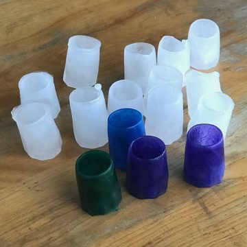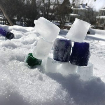 When the water turns to ice, just release them from the mold and you’re done. Freeze time was about 2 hours in the Explorations Early Learning test kitchen (which is, in fact, just our kitchen). You’ll probably want a bunch of these, so after emptying the mold, pop your new glasses onto a cookie sheet (or into a shallow container) and get them back in the freezer. Then you can make another batch. Repeat the process until you have enough for play.