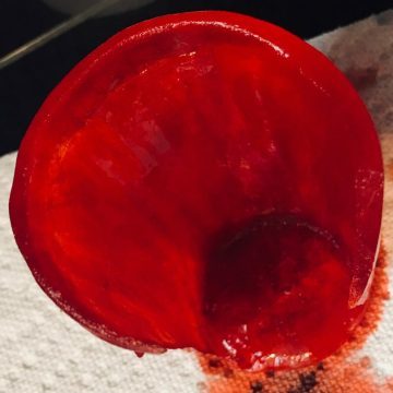 Releasing your frozen creation from it’s mold isn’t hard. Just remove it from the freezer, flip it upside down, and hold it under warm running water until the outer glass/bowl slips off. To remove the inner glass/bowl, just flip it right-side-up, fill the inner container with warm water, and wait for it to loosen. It never took more than a few minutes. You can use hot water to speed things along–but that will probably result in some cracking.