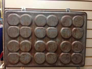 Muffin tins and cookie sheets are easy to get your hands on and easy to mount to a wall or fence (or just plop on a tabletop). I like the look of the old ones, but you could use new shiny ones if you preferred. Oil drip pans, like the one mounted to the brick wall below, are also another great option.