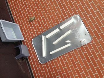 This magnet wall is made of two sheet metal panels and measures about seven feet wide and eight feet tall. It’s perfect for organizing projects I’m working on and fun for the grand-kids when they visit. It also doubles as a dry erase board (most unpainted metal surfaces will work with dry erase markers as long as the metal doesn’t begin to rust and get pitted like the one in the second image). It’s installed with adhesive caulk. Because of the outlet there was a bit of cutting and measuring to do, but basically I just applied the caulk to the wall, put the panels in place, and then used a J roller to make sure there was good contact between the mated surfaces. Planning took about 30 minutes and installation took 25. It cost about $100.