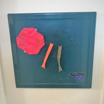 This one is installed outside our laundry room. Our washer died, so I ripped it apart for loose parts. I figured the top was perfect for a magnet board. Installation was easy. I mounted a piece of 2×4 to the wall and then mounted the salvaged metal to the board with a couple screws. It measures around 24 inches square.