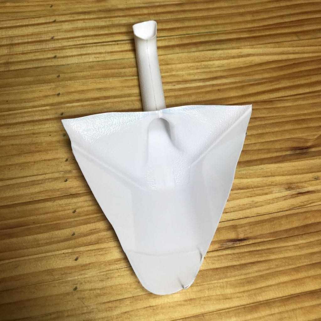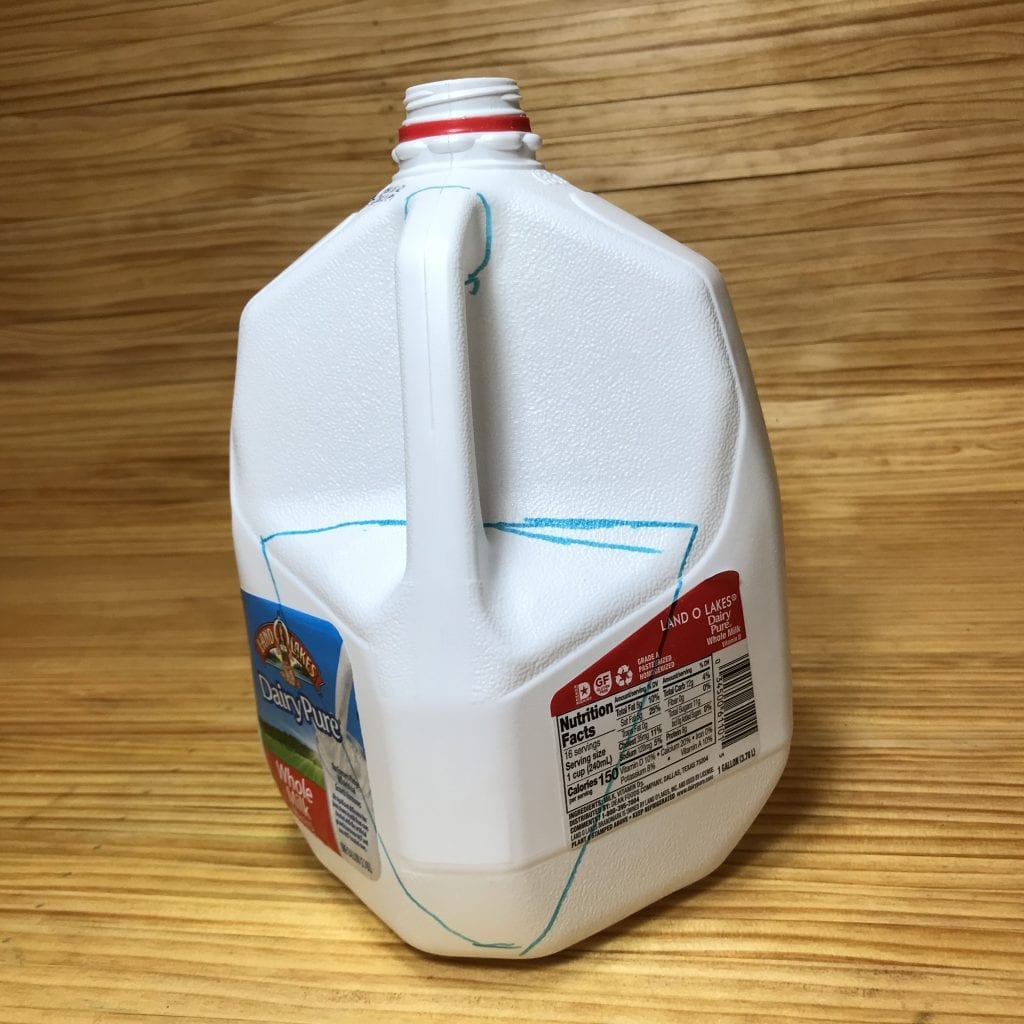 Next, use a utility knife with a sharp blade to cut your scoop from the jug. Sharp is important–you’re more likely to injure yourself with a dull blade. We cut a bunch of scoops and found the six step process outlined below to be the easiest because it reduces floppiness. Why does this matter? The less the almost-cut-out-scoop flops around, the less likely the blade is to slip and cut you.