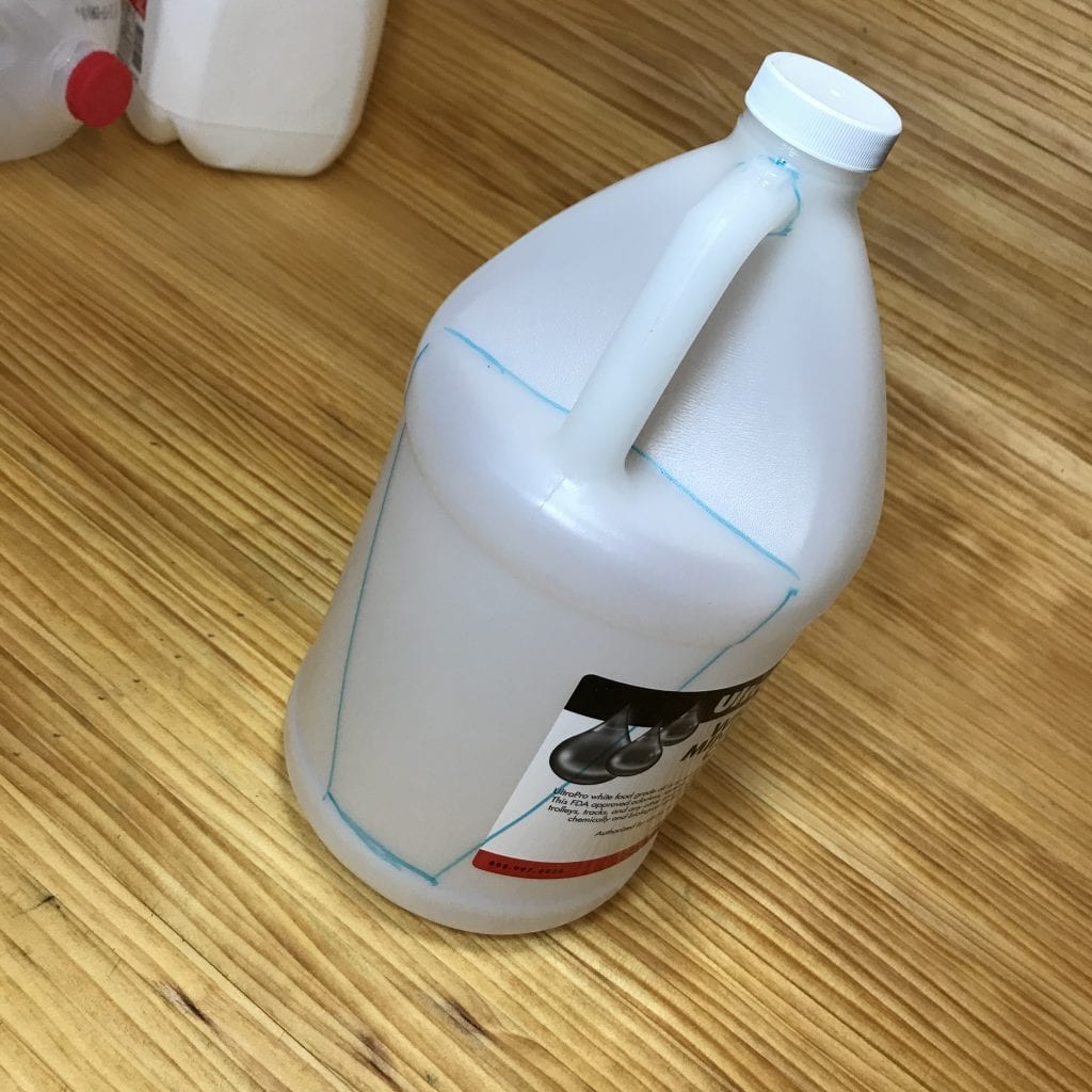 First, use a marker to sketch the basic shape of your scoop on the jug. This sketch will serve as you pattern when you start cutting in the next step. Your drawing doesn’t have to be perfect. It’s just there to help you visualize the cuts you’ll need to make.