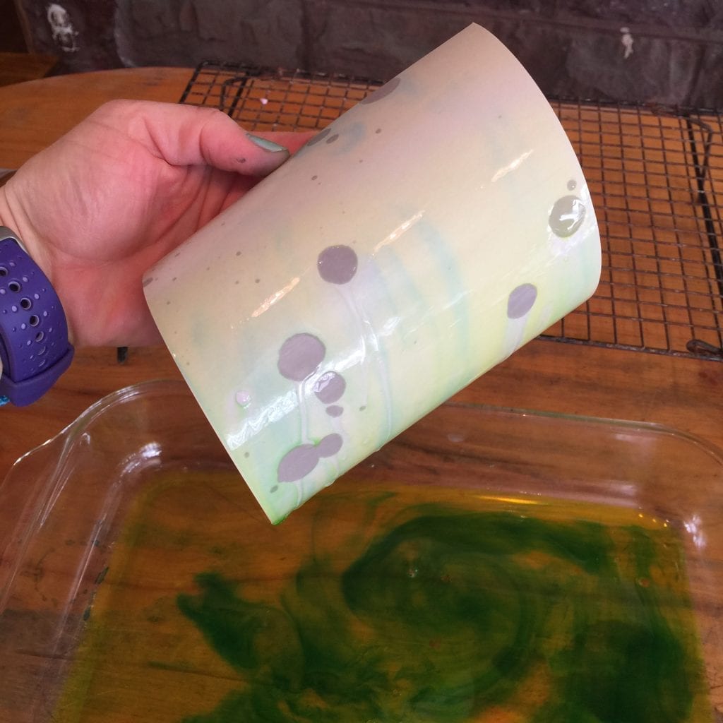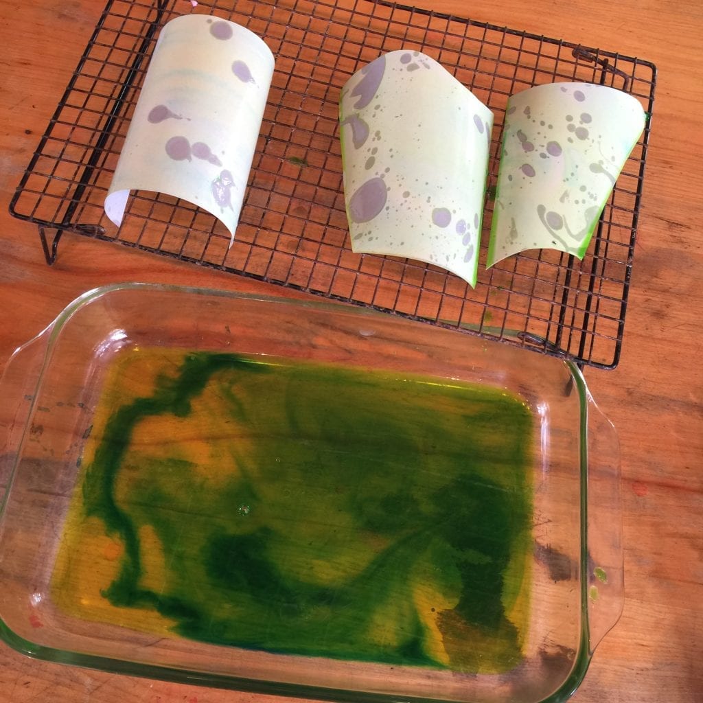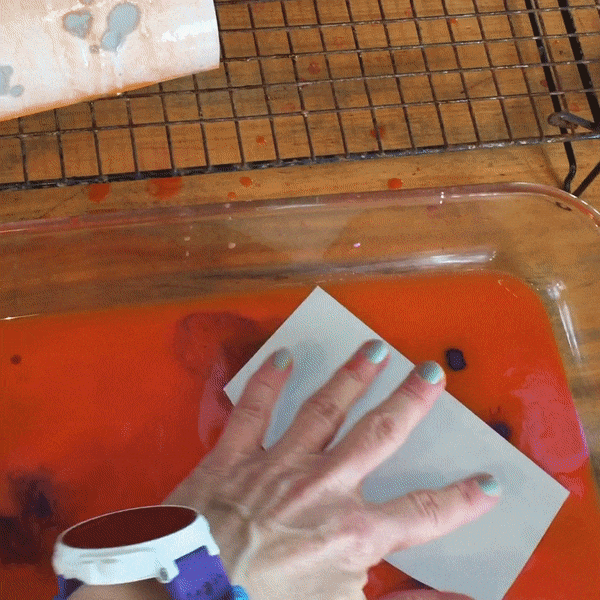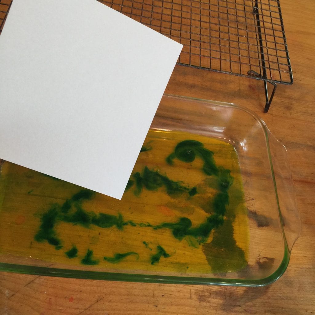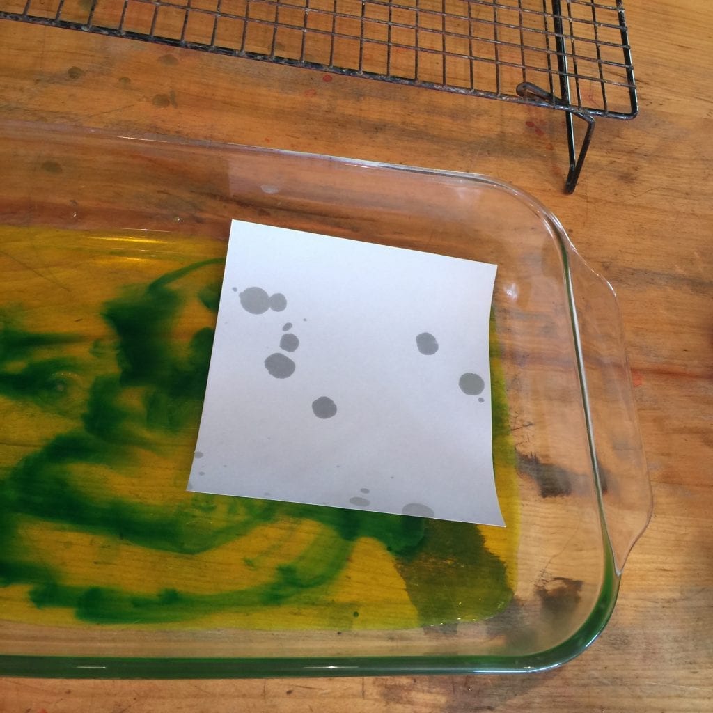 Now it’s time to make a print. Take a piece of paper and place it into the baking dish for a moment to create your print. Finally, remove the paper and place it on the drying rack.