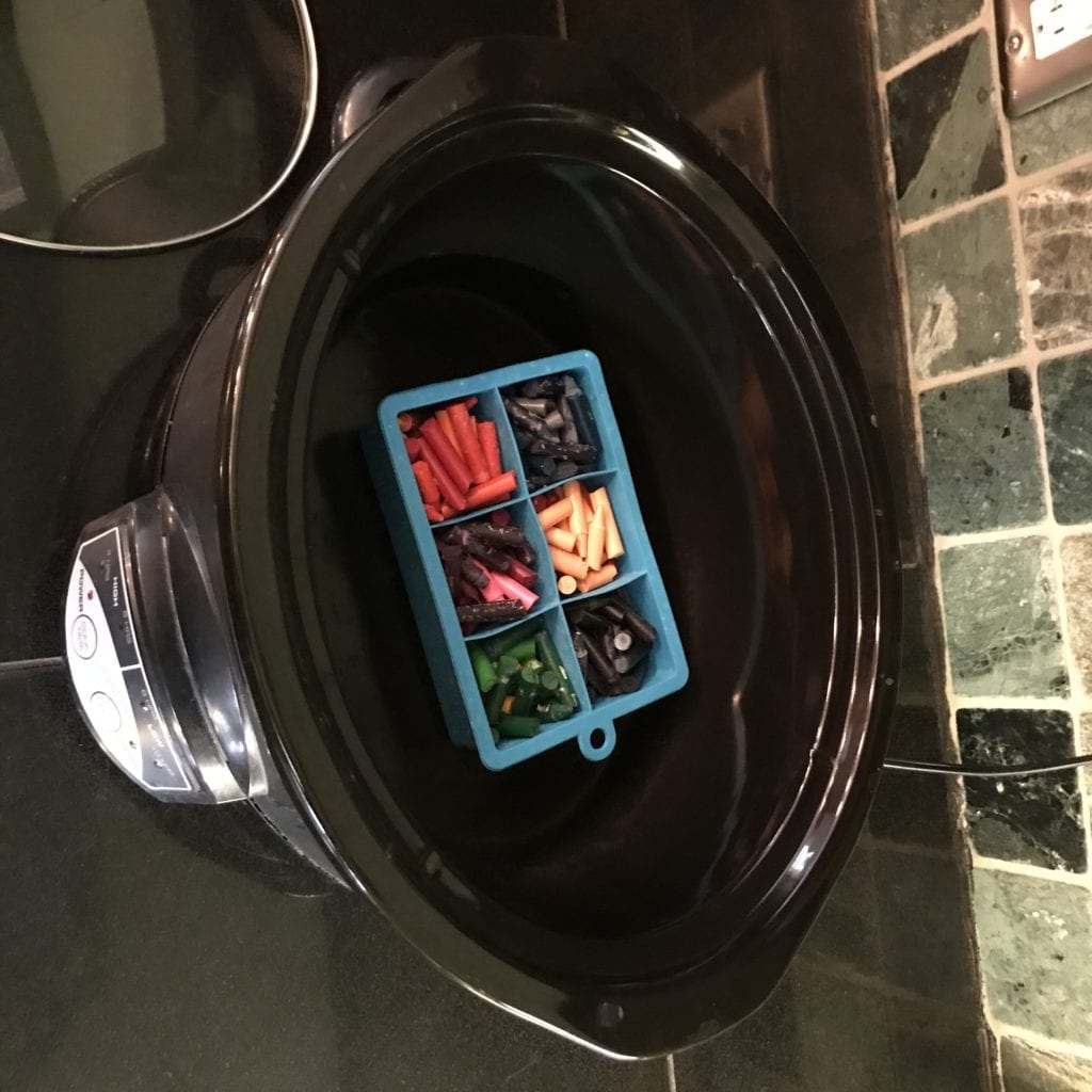 Time to heat things up. Once your containers are full, set them into your slow cooker, set the heat to medium or high, and wait. No need to put the lid on. It might speed melting a bit, but it makes observation more difficult and it’ll just become another hot item in your workspace someone could accidentally (or purposefully) touch.
