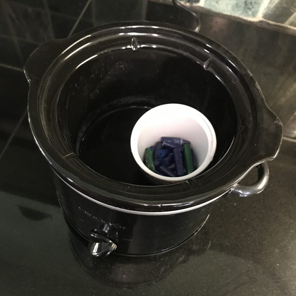 - You can add a bit of water to the slow cooker if you want. I read a couple places that this speeds up the melting process. That was true in my experiments, but I also found removing the container of molten wax was easier without the water bath. I think, especially with kids, it’s a bit safer to skip the water.