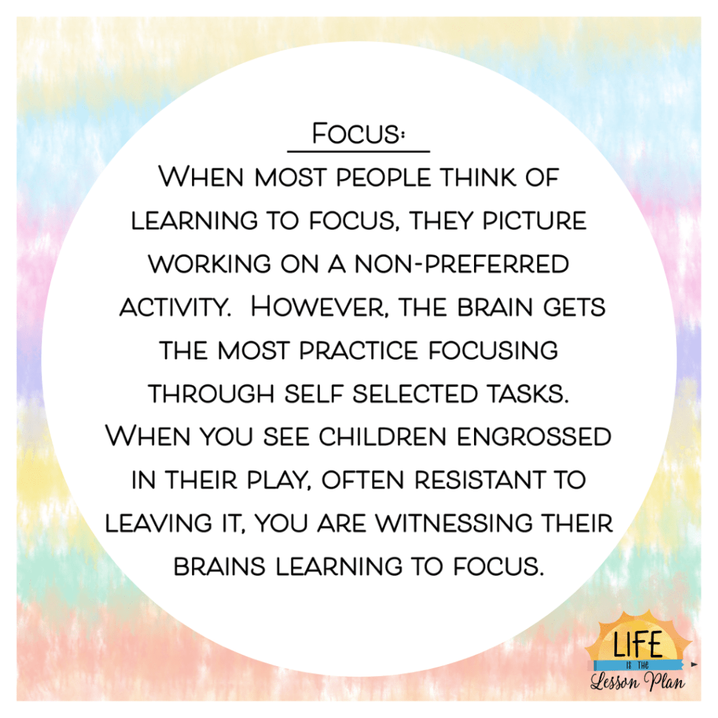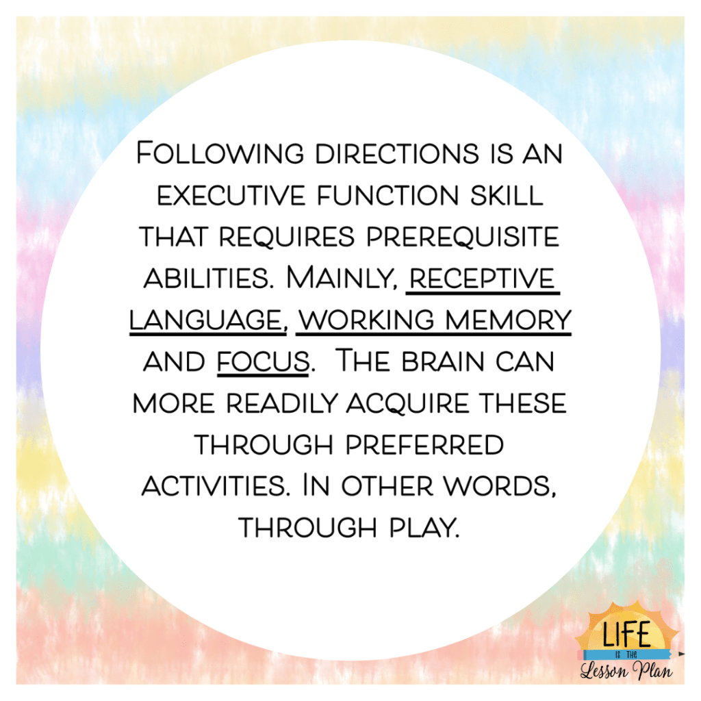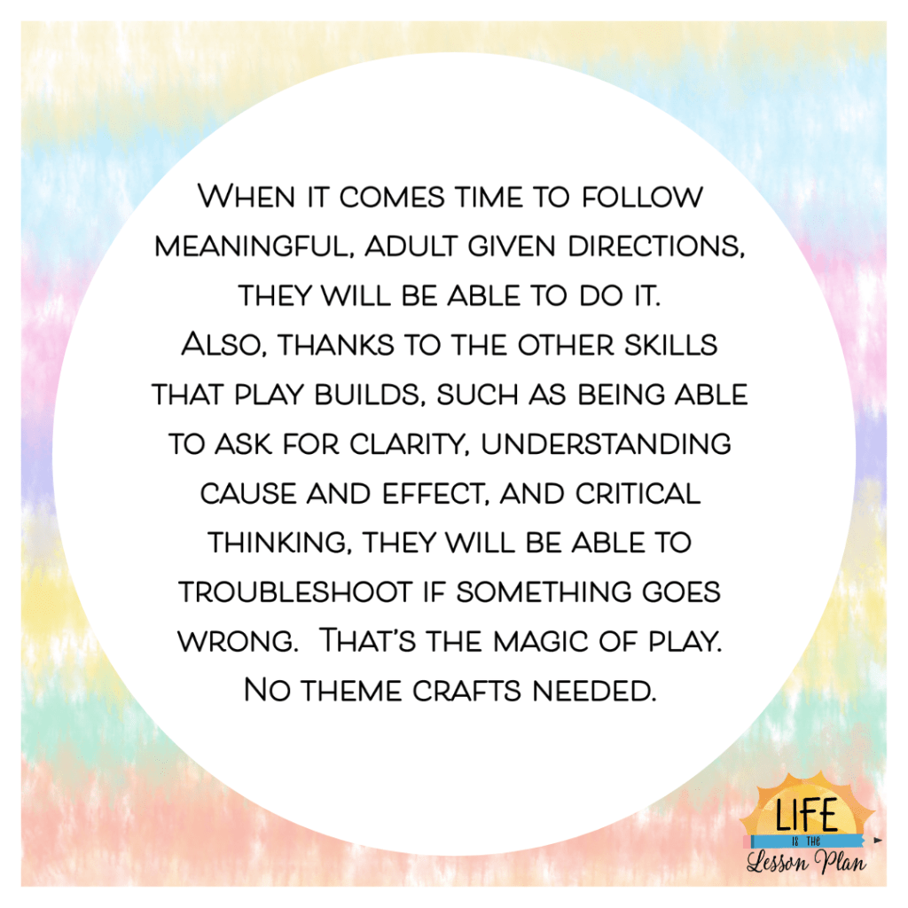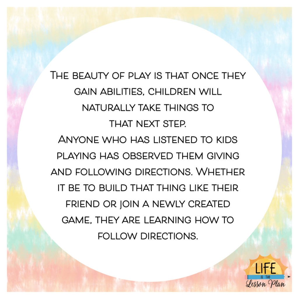 Product art is often touted as a great way to teach kids how to follow directions. In reality, the main things it teaches is that they can’t do it as well as the teacher (and sometimes other peers)and that creativity is not welcome. Making that fish for “F” week or that “cute” bear craft during bear week is not how they are going to learn how to follow directions. It might very well be how they lose self-confidence, esteem and expression though. Want to encourage children’s executive function abilities like following directions to grow? Let them play!!!