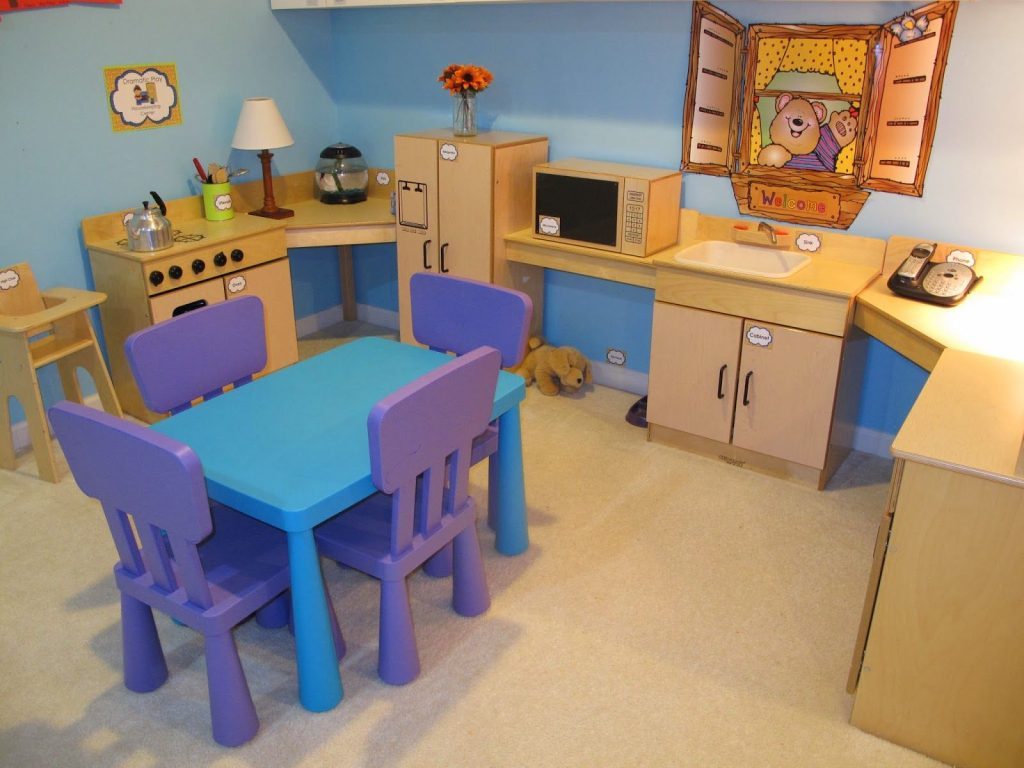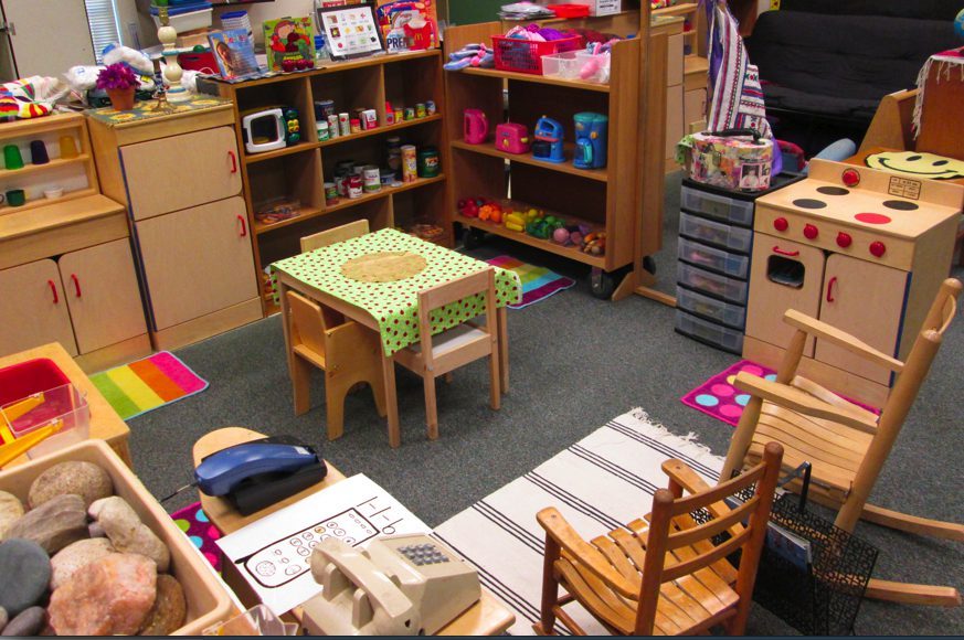 Same basic setup as in the previous photo: Housekeeping. Lots of loose parts, stuff with which to engage. I prefer this to the previous space. It feels more cozy, right?
