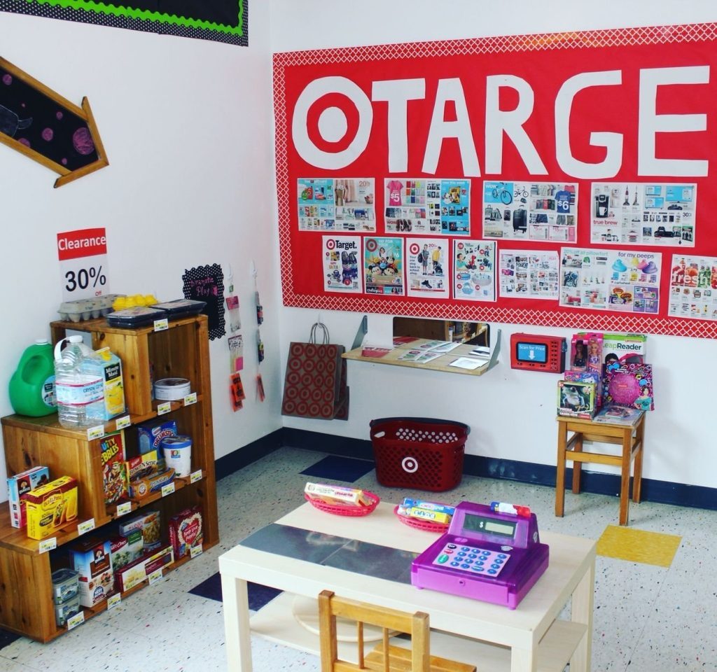 Nope. This was done by an adult. A child wouldn’t go to the trouble of acquiring an authentic Target shopping basket. A child would use a cardboard box, or backpack, or purse, or bucket, or some such already at hand container–and their imagination. Dramatic play spaces created by children are rough around the edges. Dramatic play spaces created by children are imperfect and less photogenic. Dramatic play spaces created by children look as if they were created by children.