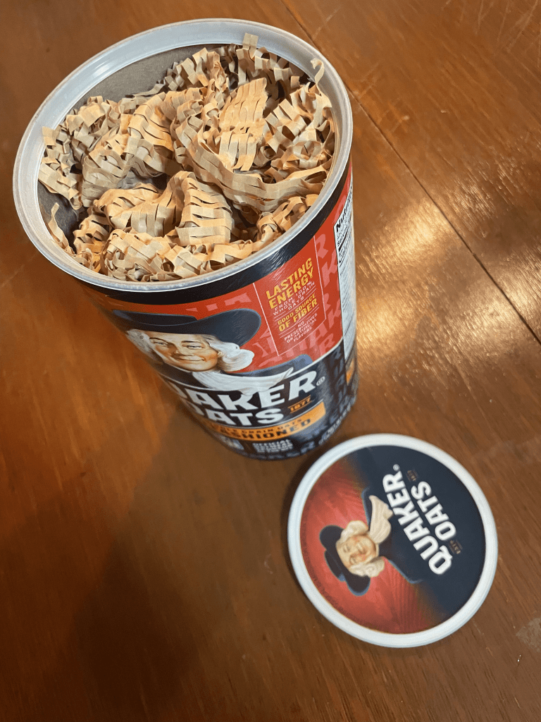 - Stuff It—if your container needs firming up, simply stuff it with plastic grocery bags, shredded paper, old wrapping paper, or recycled packing materials saved from online shopping. Most lightweight materials will do the job. The goal is to fill the container so it’s less likely to collapse when Abby stomps on it when she’s made, or Trevor sits on it when he’s feeding a babydoll.