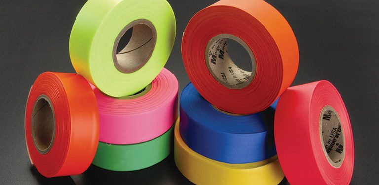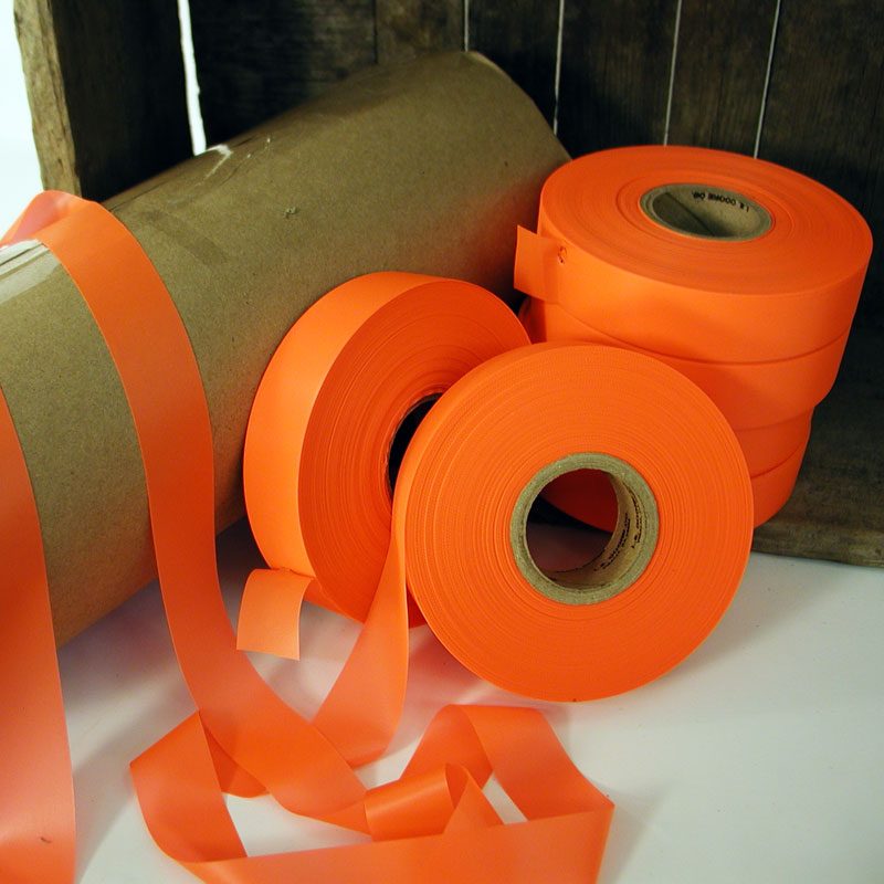 Flagging tape is a durable non-adhesive ribbon used for marking objects. It’s most commonly made of plastic (PVC or Vinyl) but biodegradable options exist. It’s available in a wide range of bright colors and patterns.