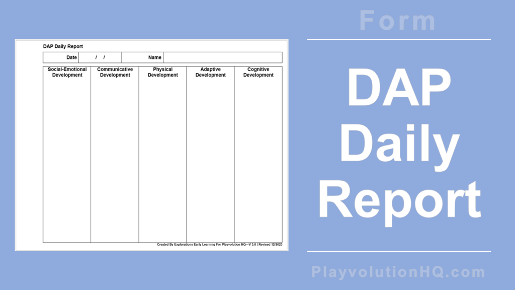 I put together this daily report form after a center director reached out seeking a quick and simple way to keep parents informed of their child’s daily activity and learning. I’ve named it the DAP Daily Report because it includes a section to report on each of 5 key developmental areas: Social-Emotional Development, Communicative Development, Physical Development, Adaptive Development, and Cognitive Development. Here’s a free PDF handout with information on these 5 Key Developmental Domains.