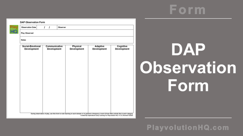 Here’s a DAP Observation form we put together using the 5 Key Developmental Domains favored here at Playvolution HQ. It’s intended to help users observe DAP (Developmentally Appropriate Practice) during play. We hope this form will help caregivers and parents pay more attention to the depth and breadth of learning taking place during play.