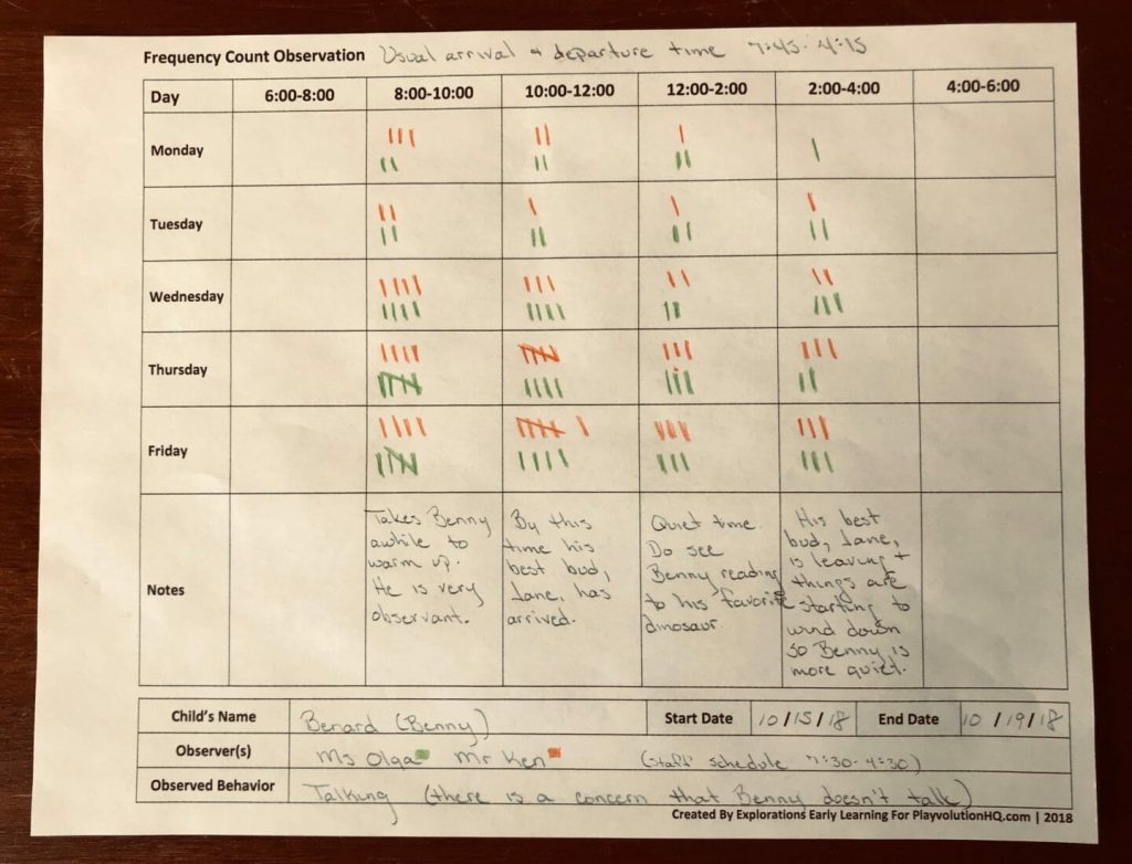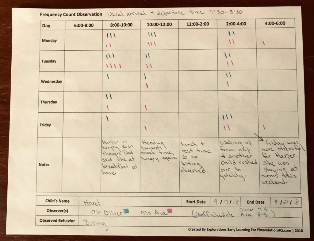 The Frequency Count Observation form is helpful if you’re trying to figure out if a behavior or activity is time-related. For example, if you have a child who is doing a lot of biting, it may be useful to know if it’s happening at a particular time of day when you’re working on a strategy to curb the behavior.