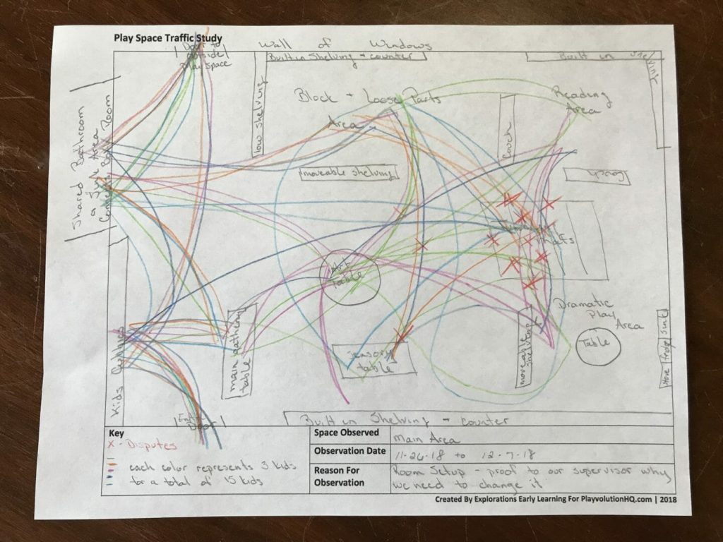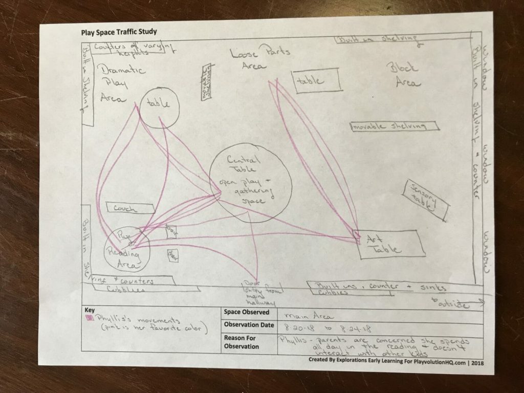Here are a couple samples of completed Play Space Traffic Study forms for an imaginary classroom: