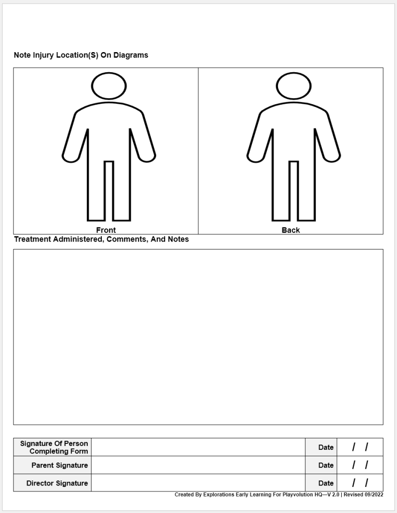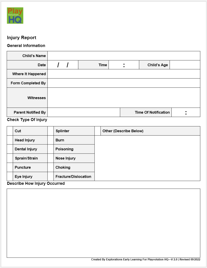 Use this Injury Report form to document serious injuries that occur in your early learning setting. This form is for reporting things like major cuts, head trauma, burns, and dental or eye injuries.