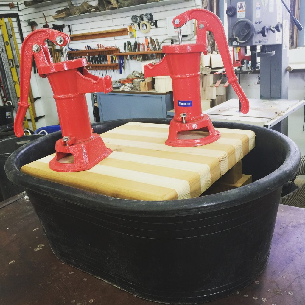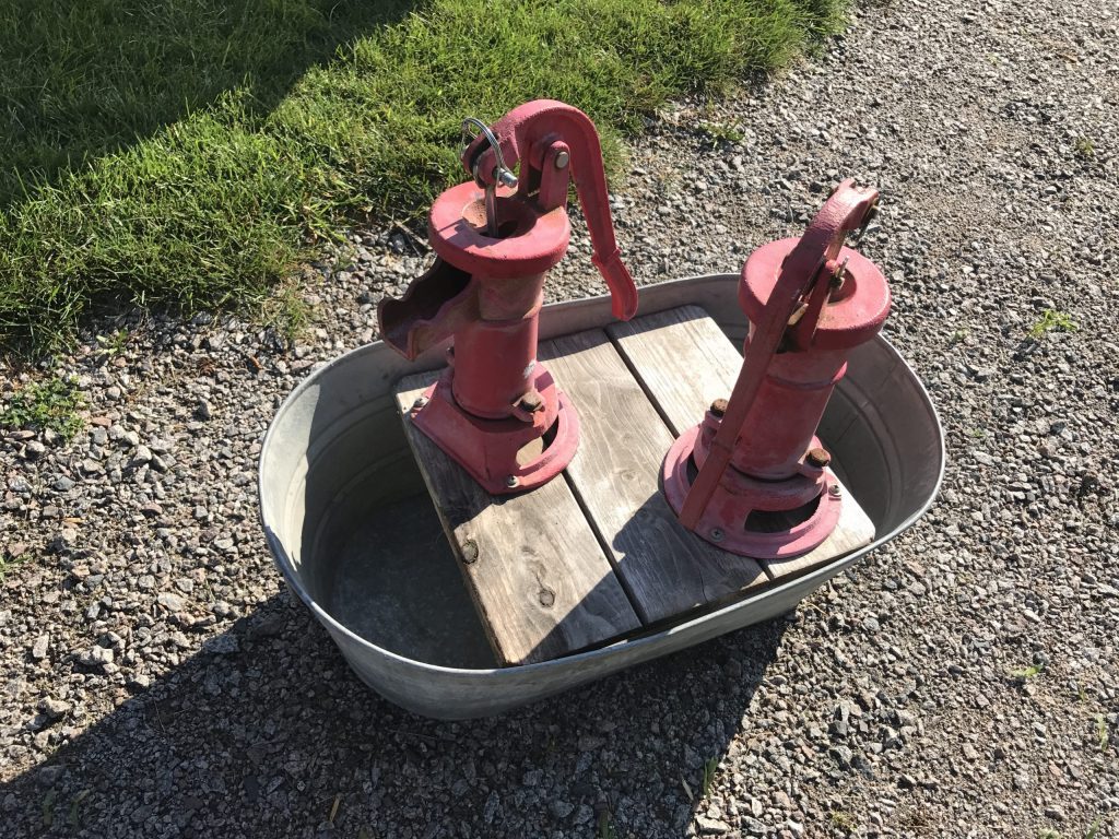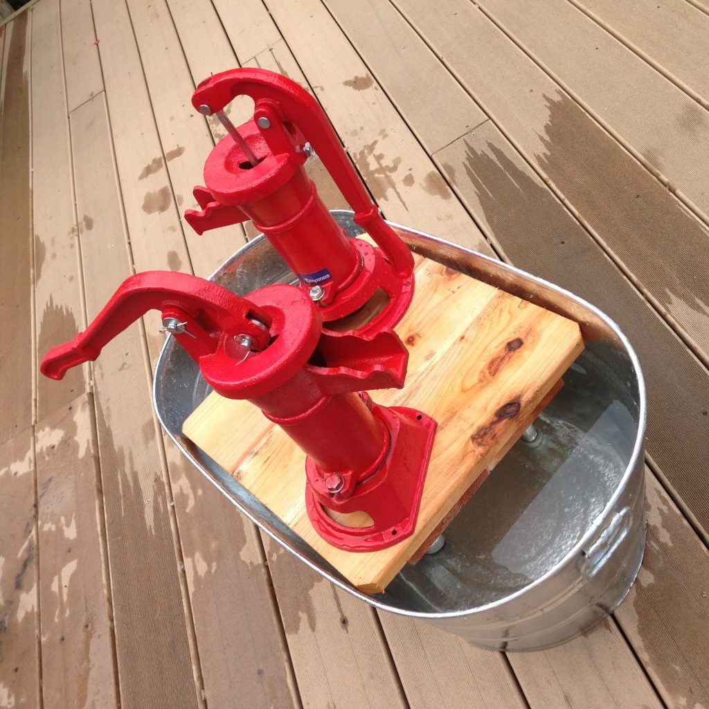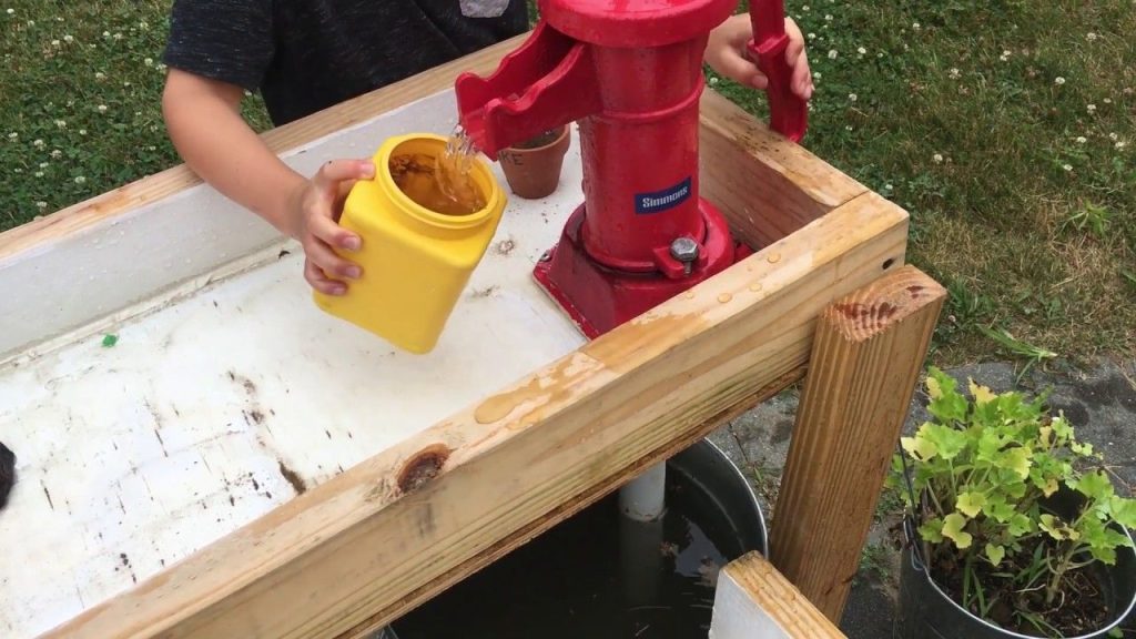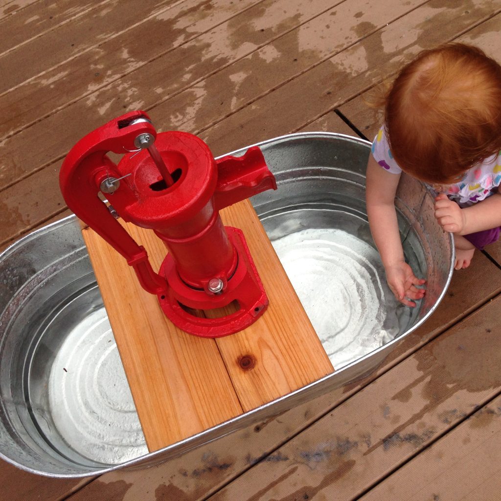 Another inexpensive option is portable hand pumps (affiliate link). There are two examples in the following photos. They’re not as durable as their cast iron cousins, but they can be decent alternatives and spark a lot of play.